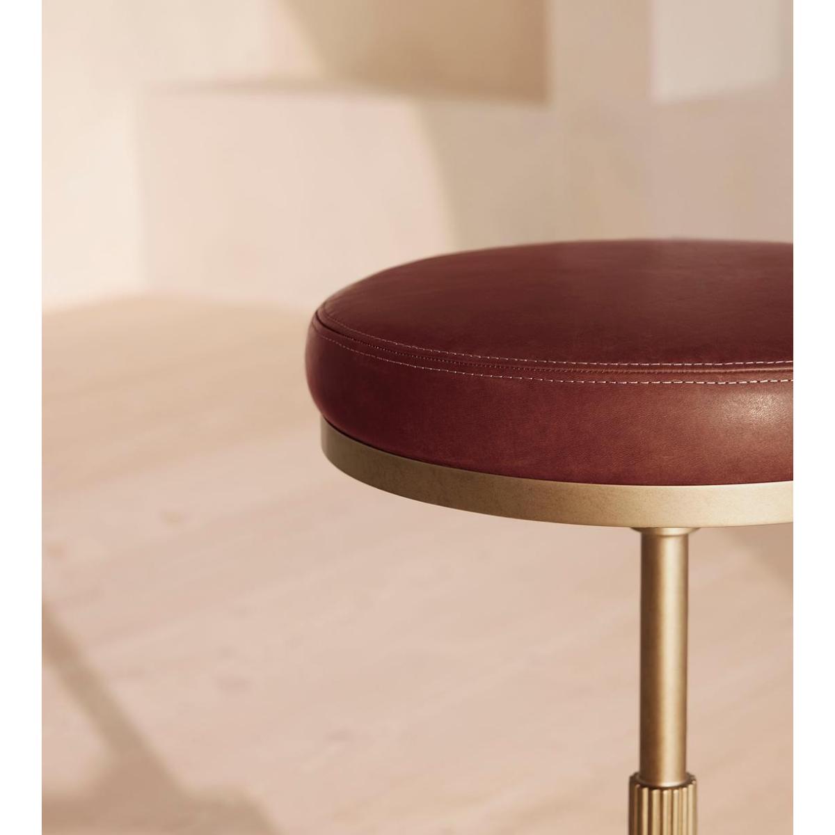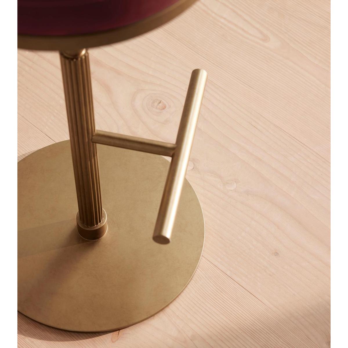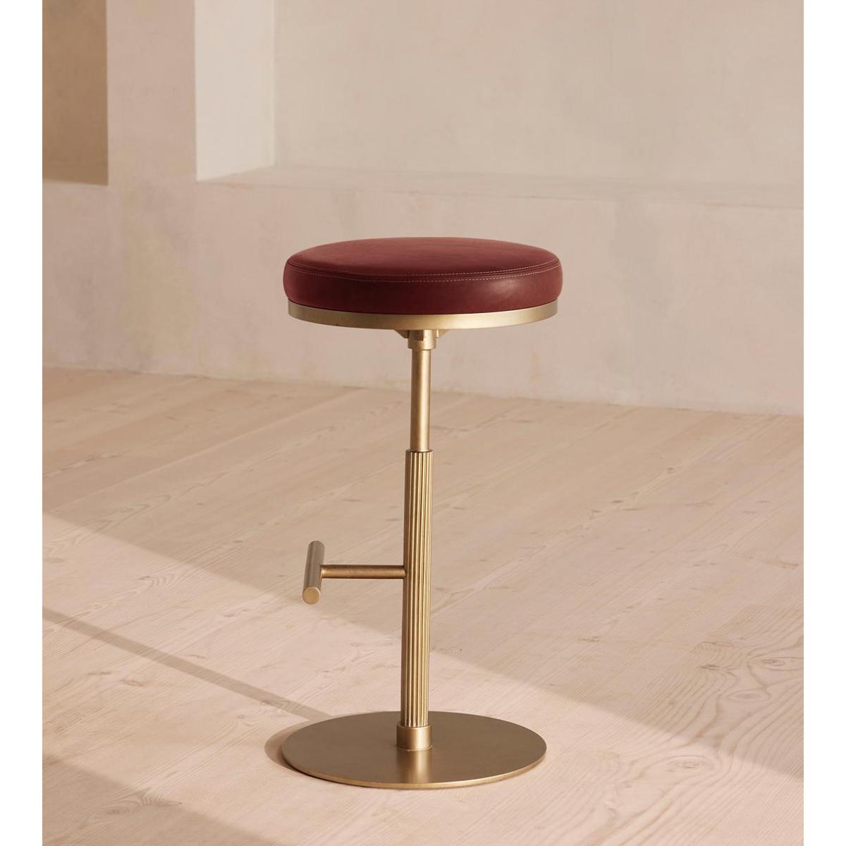 Intricate groove detailing on the central column ascends to a deep red, leather upholstered swivel seat. Bring the bar home with our Wardell counter stool, designed for at-home bar areas or open kitchen spaces. Fitted with an upholstered swivel seat to let you or your guests move with the conversation, its fixed brass stem is finished with groove detailing and a T-bar footrest.