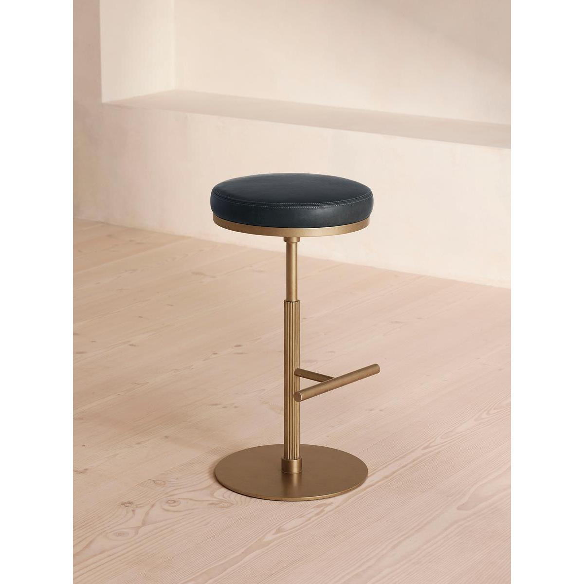 Our Wardell stool features a round, rotating seat in supple leather, detailed with double-top stitching. Inspired by Soho House Hong Kong, this counter stool has a fixed height central column with fluted detail, which descends to a T-bar footrest in a contemporary brass finish.