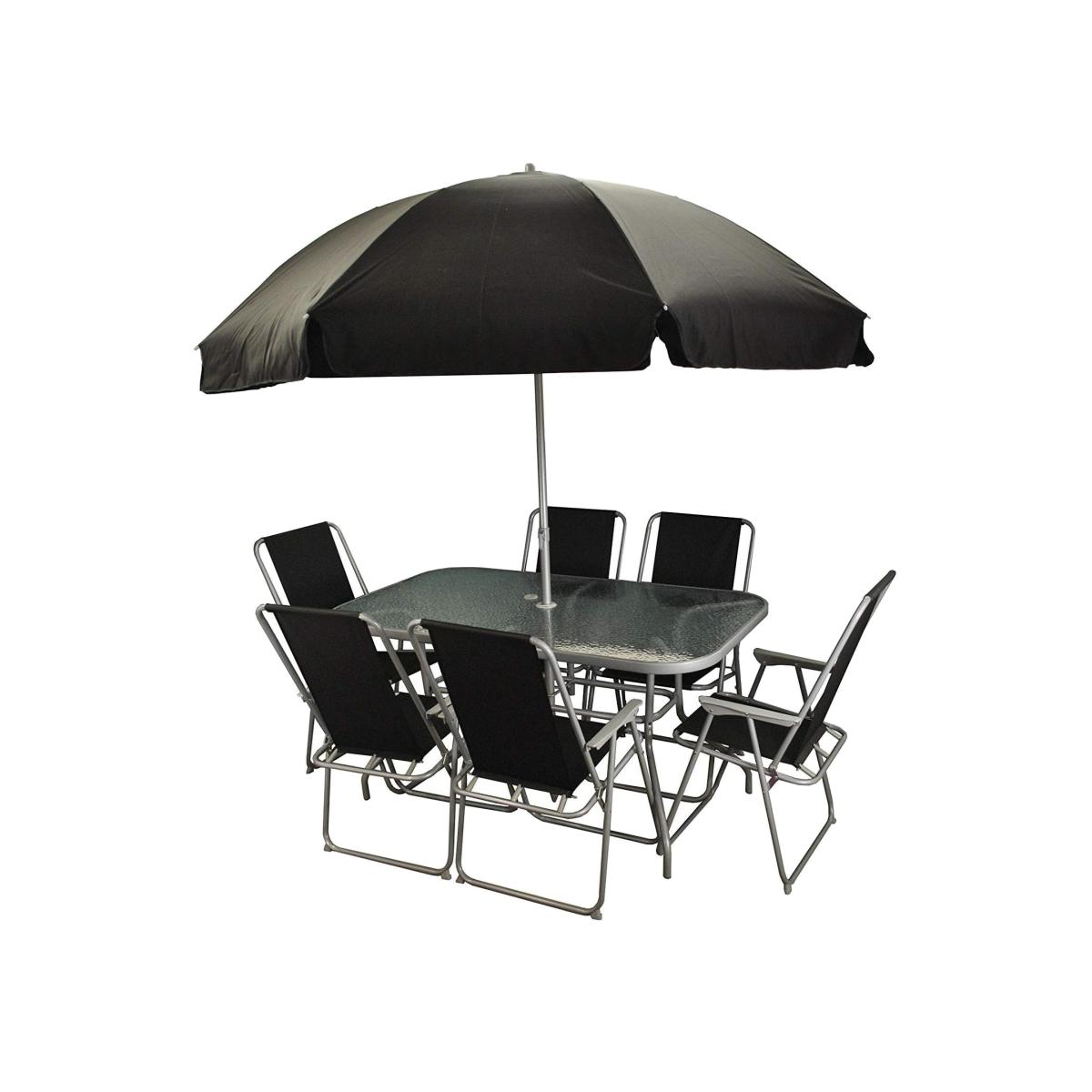 Our Wareham garden furniture set offers seating for 6 around a rectangular table with a glass top, and comes complete with an easy up parasol for instant shade. Made from grey powder coated steel, the set is highly specified to offer quality at an affordable price. The folding chairs have a waterproof black textilene seat and back which are held in place with 3 strong springs (each with a protective cover) to offer a comfortable sitting experience. The table top is made from reinforced glass with a hole for the parasol to be supported. Assembly is straight forward - a case of assembling the 4 legs and tightening with the included allen key.