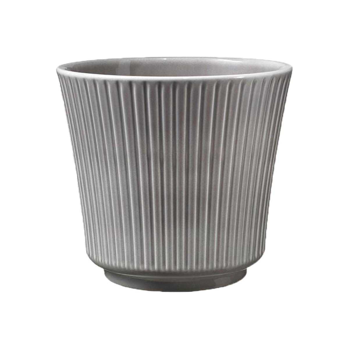 This pot comes in a warm grey shade with a ribbed embossed design. Display anywhere in the home with your favourite plants or flowers. There are no drainage holes.