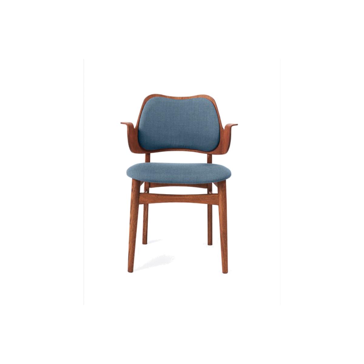 Warm Nordic Gesture chair upholstered seat and back Fabric canvas 734 denim oiled teak oak legs upholstered seat upholstered back
