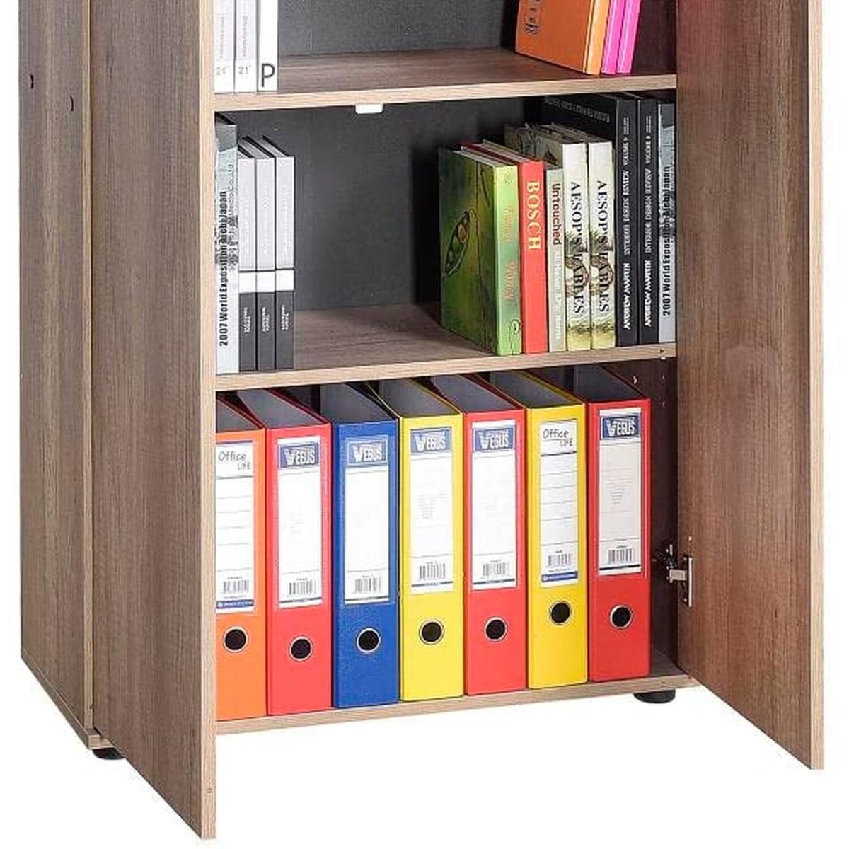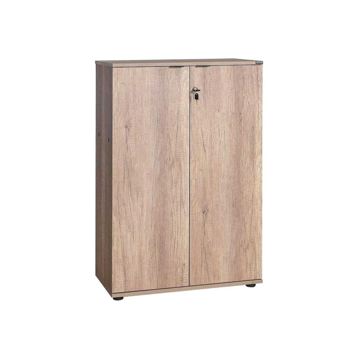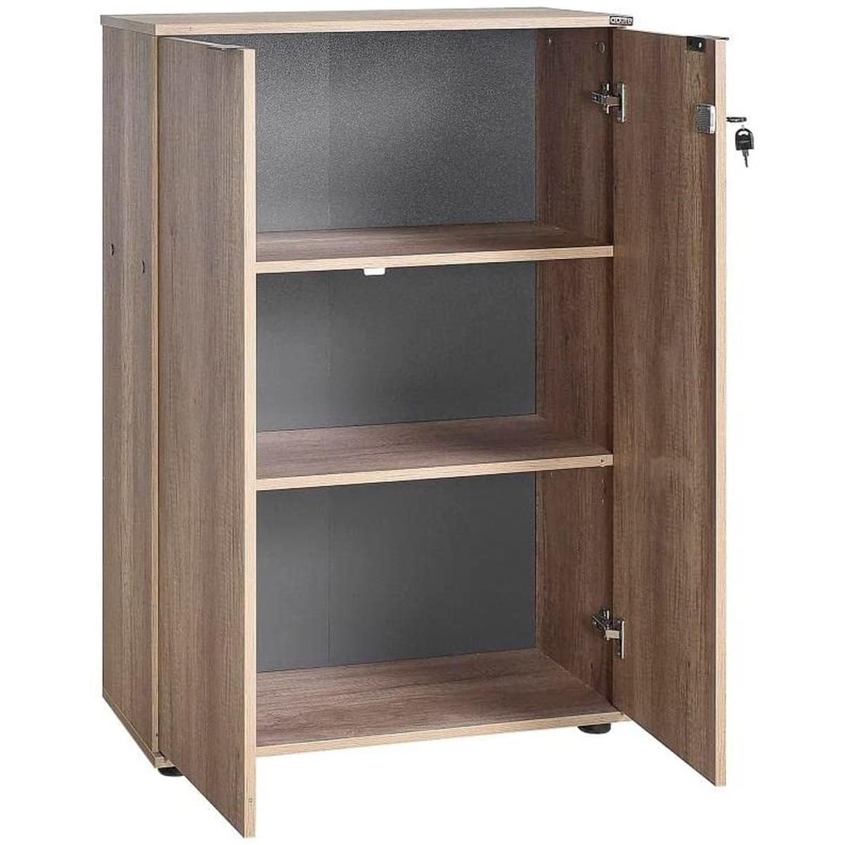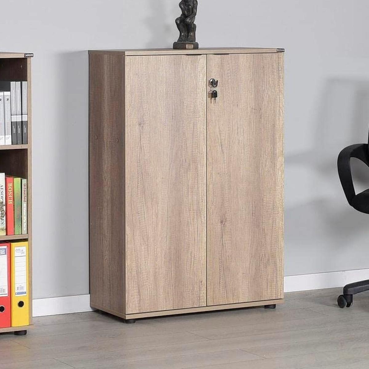 Warm Oak Home Office Lockable Filing Cabinet. Finished in a textured warm oak effect- this home office filing cabinet has 3 internal shelves and lockable doors (supplied with 2 keys). Great for keeping your home office space tidy with the added privacy of being able to lock away your files. The shelves will accommodate standard A4 folders. Part of our Rio Home Office Collection- this filing cabinet will compliment the mobile cart and corner desk from the same range. Delivered flat pack in 1 box for self assembly. Once assembled- this rustic oak finish office storage cabinet will measure 72cm wide by 109cm tall and 34cm deep.