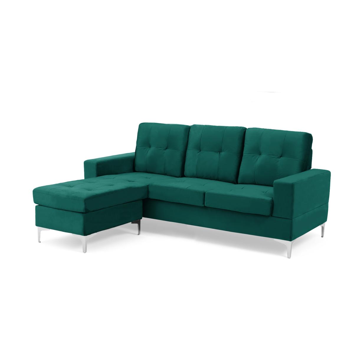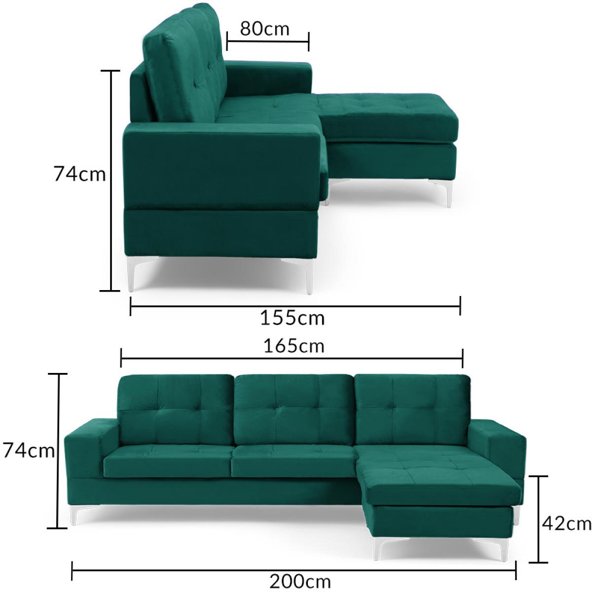 The Warren Green Velvet Reversible Chaise Sofa makes a stylish statement. With a stunning modern design, the reversible sofa features deep-filled buttoned back and seat cushions and slim chrome feet. Luxurious green velvet chaise sofa Versatile reversible design. Stunning green velvet finish. Deep-filled seat and back cushions with buttoned design Slim chrome feet complete the look