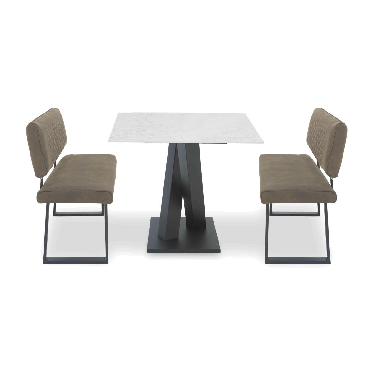Bold, modern and distinctive, our Warrior dining furniture range offers two fabulous looks and a really extensive range of options. The collection’s dining tables are topped with sintered stone, beautifully smooth and exceptionally hardwearing, in a choice of industrial-cool dark grey and modern luxe marble-effect white. Dining tables, whether extending or compact, have striking metal bases and are available paired with Warrior dining chairs and dining benches. This eye-catching collection makes it easy to create the dining set that suits your aesthetic and your space, and also includes sideboards and display shelving. The Warrior range is exclusively available at Furniture Village. The dining benches in this dining set may be designed for versatility but they’re still extraordinarily comfy. We think you’ll like the luxurious stone-topped compact dining table too. Why you'll love it All-modern dining style is all-round fabulous. Statement compact dining table has a durable sintered stone top. Sleek white marble-effect finish. Dark grey V-shaped base is made of powder-coated metal. Comes with 2 space-saving and versatile dining benches. Benches have U-shaped metal legs. In a choice of fabric colours with quilted-effect stitching. This dining set is also available with an industrial-style grey sintered stone table. Only at Furniture Village. This compact dining set is part of our Warrior range. What you need to know Table seats 6. Each high back bench seats 2. Benches are cushioned with foam. Sintered stone table top is made from natural stone. Wipe clean with a damp cloth and dry with a soft duster. Avoid abrasive cloths and cleaning materials. Use placemats and coasters at all times to protect the surface. Shop the extensive Warrior range for dining tables, dining sets and more.