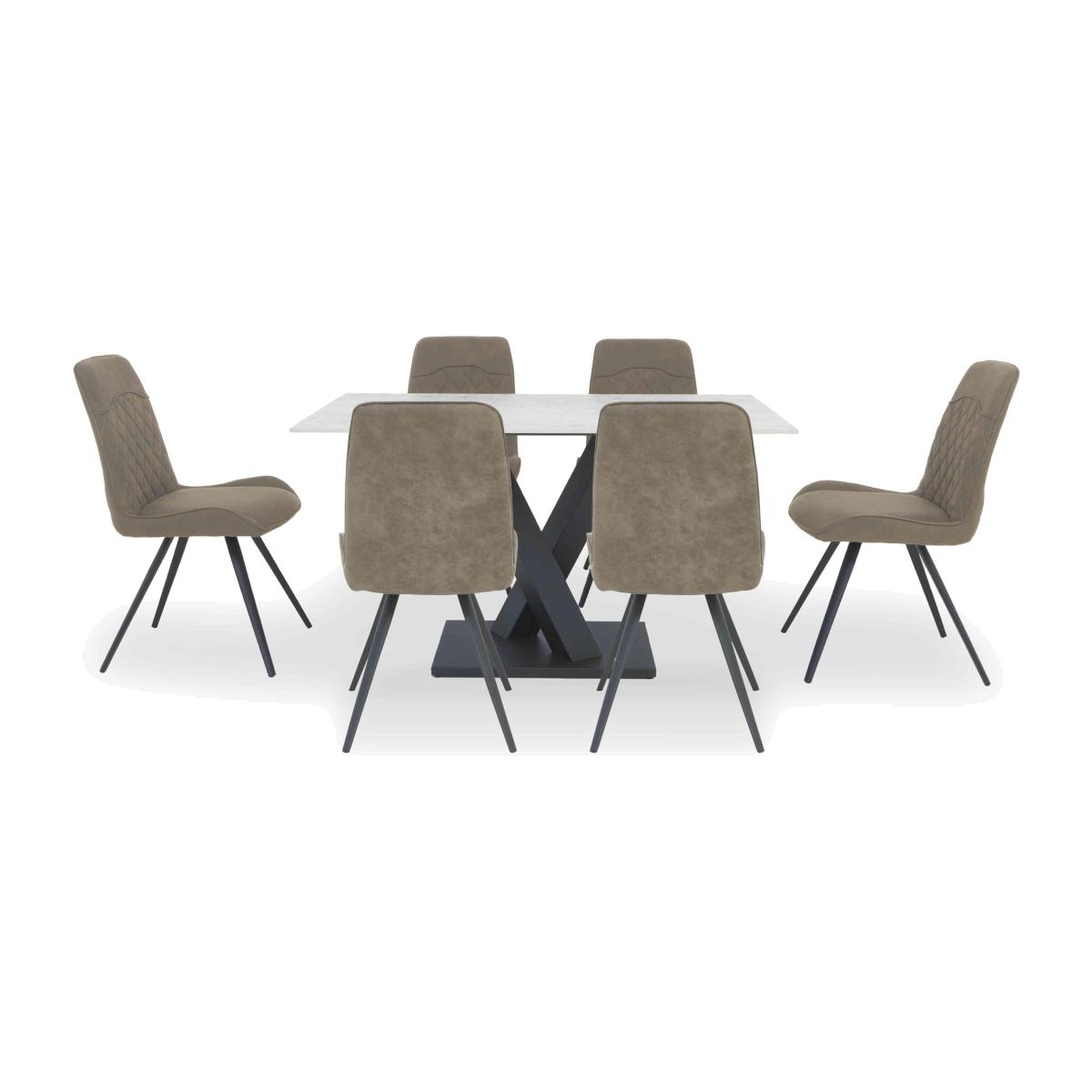 Bold, modern and distinctive, our Warrior dining furniture range offers two fabulous looks and a really extensive range of options. The collection’s dining tables are topped with sintered stone, beautifully smooth and exceptionally hardwearing, in a choice of industrial-cool dark grey and modern luxe marble-effect white. Dining tables, whether extending or compact, have striking metal bases and are available paired with Warrior dining chairs and dining benches. This eye-catching collection makes it easy to create the dining set that suits your aesthetic and your space, and also includes sideboards and display shelving. The Warrior range is exclusively available at Furniture Village. Compact dining is super-stylish with this gorgeous dining set. The sleek white marble-effect table is made of durable sintered stone, and the set includes six chairs. Why you'll love it All-modern dining style is all-round fabulous. Statement compact dining table has a durable sintered stone top. Sleek white marble-effect finish. Dark grey V-shaped base is made of powder-coated metal. With 6 gently curved and well-cushioned dining chairs. Slender angled metal legs. Fabric upholstery in a choice of colours. Quilted-effect stitching. This dining set is also available with an industrial-style grey sintered stone table. Only at Furniture Village. This compact dining set is part of our Warrior range. What you need to knowChairs are cushioned with foam. Table seats 6. Sintered stone table top is made from natural stone. Wipe clean with a damp cloth and dry with a soft duster. Avoid abrasive cloths and cleaning materials. Use placemats and coasters at all times to protect the surface. Shop the extensive Warrior range for dining tables, dining sets and more.