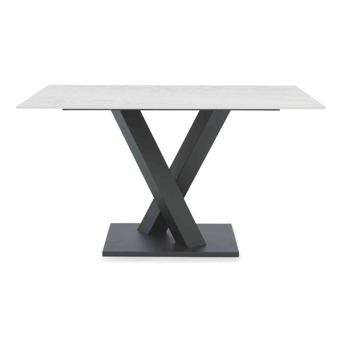 Bold, modern and distinctive, our Warrior dining furniture range offers two fabulous looks and a really extensive range of options. The collection’s dining tables are topped with sintered stone, beautifully smooth and exceptionally hardwearing, in a choice of industrial-cool dark grey and modern luxe marble-effect white. Dining tables, whether extending or compact, have striking metal bases and are available paired with Warrior dining chairs and dining benches. This eye-catching collection makes it easy to create the dining set that suits your aesthetic and your space, and also includes sideboards and display shelving. The Warrior range is exclusively available at Furniture Village. Seating six in statement dining style, the modern table in this dining set has a beautiful marble-effect sintered stone top and a space-saving V-shaped base. Exclusive to Furniture Village. Why you'll love it All-modern dining style is all-round fabulous. Statement compact dining table has a durable sintered stone top. Sleek white marble-effect finish. Dark grey V-shaped base is made of powder-coated metal. This table is also available with an industrial-style grey sintered stone top. Only at Furniture Village. This compact dining table is part of our Warrior range. What you need to know Seats 6. Sintered stone table top is made from natural stone. Wipe clean with a damp cloth and dry with a soft duster. Avoid abrasive cloths and cleaning materials. Use placemats and coasters at all times to protect the surface. Shop the extensive Warrior range for dining tables, dining sets and more.