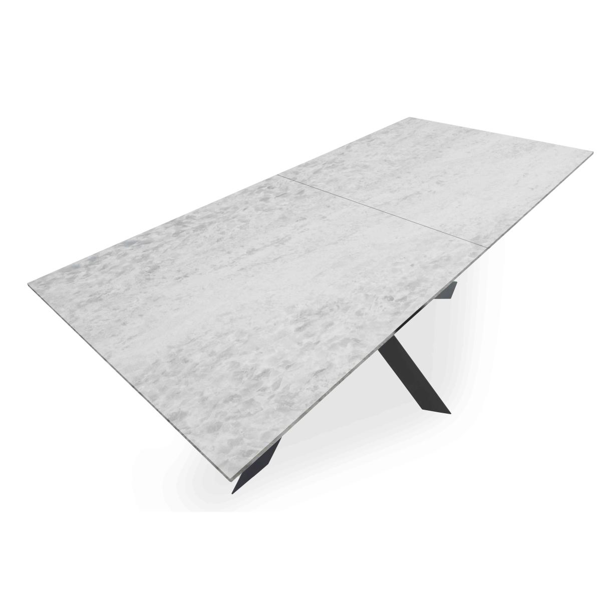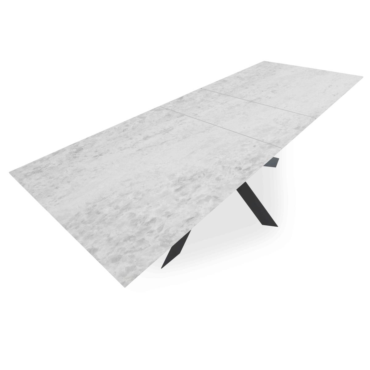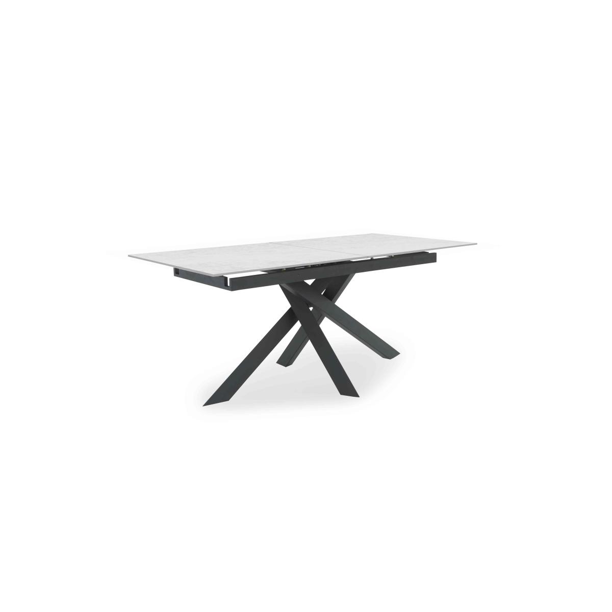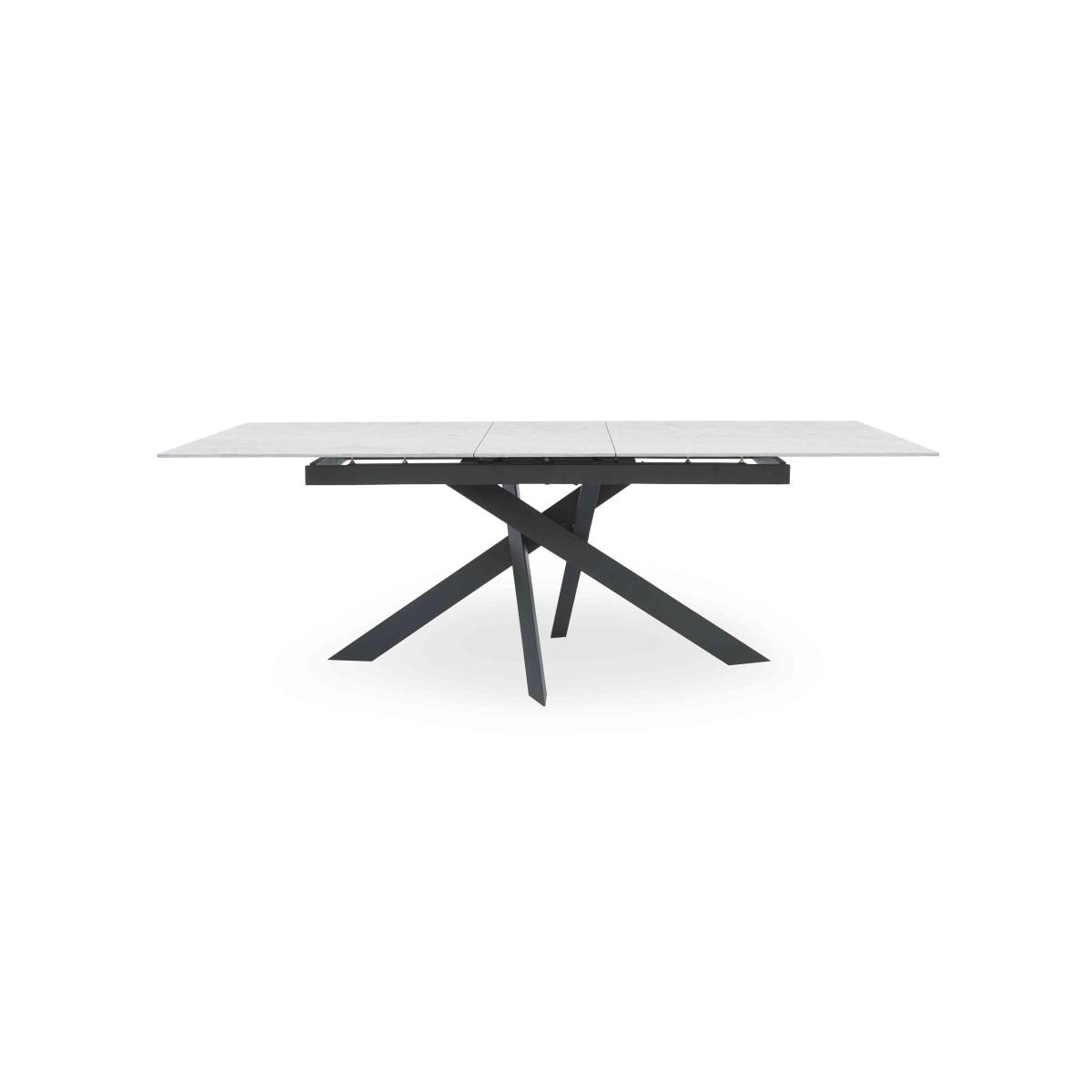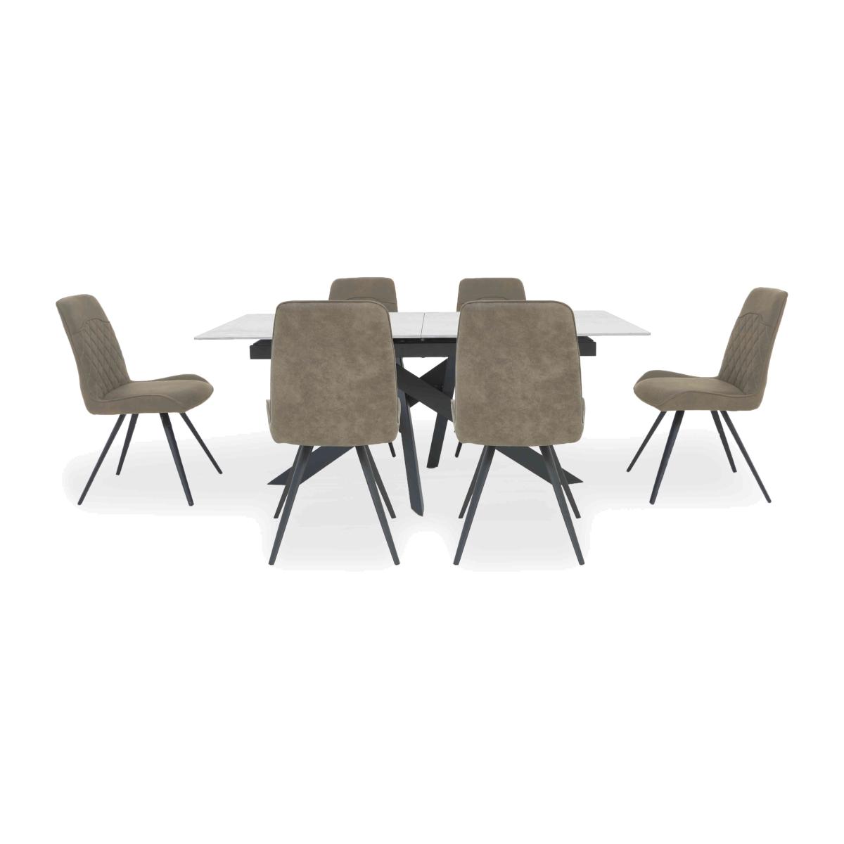 Bold, modern and distinctive, our Warrior dining furniture range offers two fabulous looks and a really extensive range of options. The collection’s dining tables are topped with sintered stone, beautifully smooth and exceptionally hardwearing, in a choice of industrial-cool dark grey and modern luxe marble-effect white. Dining tables, whether extending or compact, have striking metal bases and are available paired with Warrior dining chairs and dining benches. This eye-catching collection makes it easy to create the dining set that suits your aesthetic and your space, and also includes sideboards and display shelving. The Warrior range is exclusively available at Furniture Village. This beautiful dining set brings together industrial cool and modern luxury. The sintered stone top of the extending dining table has a marble-effect finish that’s just so striking. Why you'll love it All-modern dining style is all-round fabulous. Statement extending dining table features a very cool asymmetric base. Tough sintered stone table top has a sleek white marble-effect finish. Base is crafted in black powder-coated metal. Extends in seconds – simply pull on the table top ends and a hidden leaf pops up. With 6 gently curved and well-cushioned dining chairs. Slender angled metal legs. Fabric upholstery in a choice of colours. Quilted-effect stitching. This dining set is also available with an industrial-style grey sintered stone table. Only at Furniture Village. This dining set is part of our Warrior range. What you need to know Chairs are cushioned with foam. Extending dining table seats 8 when closed and 10 when extended. Sintered stone table top is made from natural stone. Wipe clean with a damp cloth and dry with a soft duster. Avoid abrasive cloths and cleaning materials. Use placemats and coasters at all times to protect the surface. Shop the extensive Warrior range for dining tables, dining sets and more. Item code: WARRSET-08-001