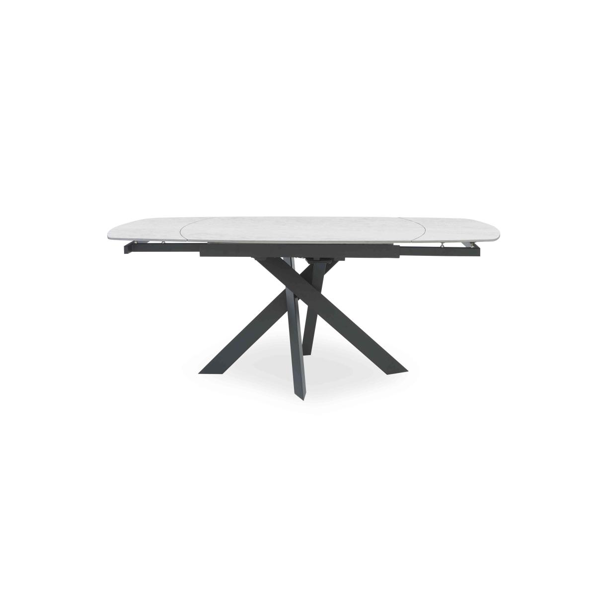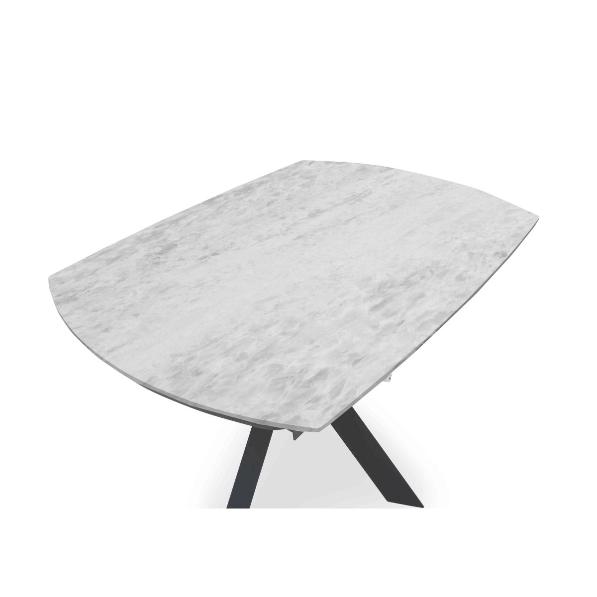 Bold, modern and distinctive, our Warrior dining furniture range offers two fabulous looks and a really extensive range of options. The collection’s dining tables are topped with sintered stone, beautifully smooth and exceptionally hardwearing, in a choice of industrial-cool dark grey and modern luxe marble-effect white. Dining tables, whether extending or compact, have striking metal bases and are available paired with Warrior dining chairs and dining benches. This eye-catching collection makes it easy to create the dining set that suits your aesthetic and your space, and also includes sideboards and display shelving. The Warrior range is exclusively available at Furniture Village. Sleek, chic and very stylish, this modern dining set has a beautiful white sintered stone-topped table which extends with a swivel mechanism. This dining set includes four dining chairs. Why you'll love it All-modern dining style is all-round fabulous. Statement extending dining table features a very cool asymmetric base. Tough sintered stone table top has a sleek white marble-effect finish. Base is crafted in black powder-coated metal. Innovative centre swivel mechanism extends this table in seconds. Set of 4 on-trend dining chairs with back-hugging curves and deep cushioning. Stylish cantilever metal bases. Fabric upholstery in a choice of colours. Quilted-effect stitching. This dining set is also available with an industrial-style grey sintered stone table. Only at Furniture Village. This swivel extending dining set is part of our Warrior range. What you need to know Chairs are cushioned with foam. Extending dining table seats 6 when closed and 8 when extended. Sintered stone table top is made from natural stone. Wipe clean with a damp cloth and dry with a soft duster. Avoid abrasive cloths and cleaning materials. Use placemats and coasters at all times to protect the surface. Shop the extensive Warrior range for dining tables, dining sets and more. Item code: WARRSET-31-001
