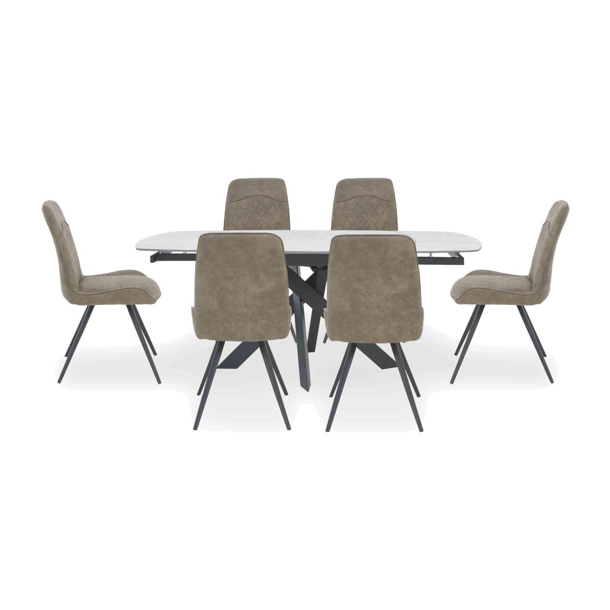 Bold, modern and distinctive, our Warrior dining furniture range offers two fabulous looks and a really extensive range of options. The collection’s dining tables are topped with sintered stone, beautifully smooth and exceptionally hardwearing, in a choice of industrial-cool dark grey and modern luxe marble-effect white. Dining tables, whether extending or compact, have striking metal bases and are available paired with Warrior dining chairs and dining benches. This eye-catching collection makes it easy to create the dining set that suits your aesthetic and your space, and also includes sideboards and display shelving. The Warrior range is exclusively available at Furniture Village. You’ll love to entertain with this beautiful dining set. The dining table has a very cool swivel extension mechanism and a beautiful marble-look sintered stone top. With six stylish dining chairs. Why you'll love it All-modern dining style is all-round fabulous. Statement extending dining table features a very cool asymmetric base. Tough sintered stone table top has a sleek white marble-effect finish. Base is crafted in black powder-coated metal. Innovative centre swivel mechanism extends this table in seconds. With 6 gently curved and well-cushioned dining chairs. Slender angled metal legs. Fabric upholstery in a choice of colours. Quilted-effect stitching. This dining set is also available with an industrial-style grey sintered stone table. Only at Furniture Village. This swivel extending dining set is part of our Warrior range. What you need to know Chairs are cushioned with foam. Extending dining table seats 6 when closed and 8 when extended. Sintered stone table top is made from natural stone. Wipe clean with a damp cloth and dry with a soft duster. Avoid abrasive cloths and cleaning materials. Use placemats and coasters at all times to protect the surface. Shop the extensive Warrior range for dining tables, dining sets and more.