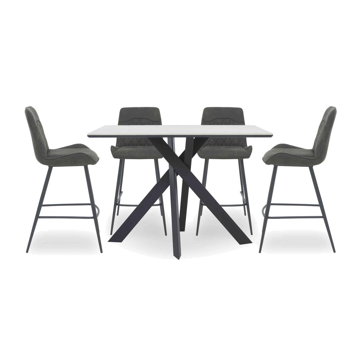 Bold, modern and distinctive, our Warrior dining furniture range offers two fabulous looks and a really extensive range of options. The collection’s dining tables are topped with sintered stone, beautifully smooth and exceptionally hardwearing, in a choice of industrial-cool dark grey and modern luxe marble-effect white. Dining tables, whether extending or compact, have striking metal bases and are available paired with Warrior dining chairs and dining benches. This eye-catching collection makes it easy to create the dining set that suits your aesthetic and your space, and also includes sideboards and display shelving. The Warrior range is exclusively available at Furniture Village. Perfect for a fashionably elegant kitchen diner, this bar table set comprises a sintered stone-topped bar table and a set of four bar stools. Only at Furniture Village. Why you'll love it All-modern dining style is all-round fabulous. This striking bar table set brings cool style to casual dining spaces. Bar table has a tough sintered stone top with a sleek white marble-effect finish. Stylish asymmetric base is crafted in black powder-coated metal. Set includes 4 elegant bar stools. So comfortable with back-hugging curves and deep cushioning. In a choice of fabric colours with quilted-effect stitching. This set is also available with an industrial grey sintered stone top. Only at Furniture Village. This bar table dining set is part of our Warrior range. What you need to know Bar stools have metal legs and footrests. Cushioned with foam. Bar table seats 6. Sintered stone table top is made from natural stone. Wipe clean with a damp cloth and dry with a soft duster. Avoid abrasive cloths and cleaning materials. Use placemats and coasters at all times to protect the surface. Shop the extensive Warrior range for dining tables, dining sets and more.