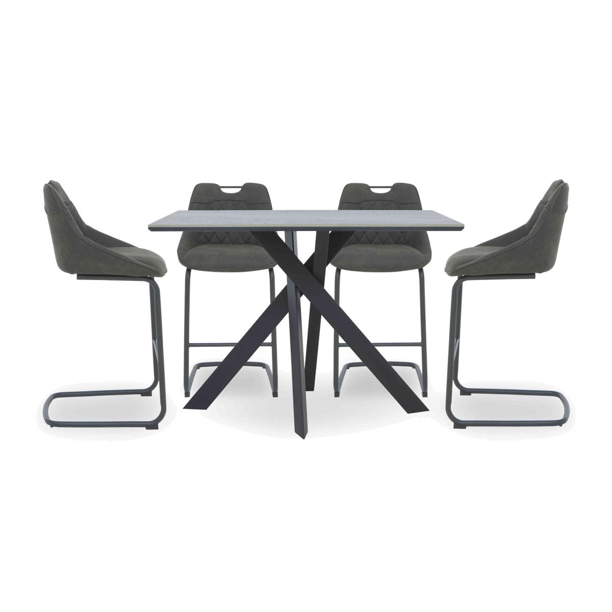 Bold, modern and distinctive, our Warrior dining furniture range offers two fabulous looks and a really extensive range of options. The collection’s dining tables are topped with sintered stone, beautifully smooth and exceptionally hardwearing, in a choice of industrial-cool dark grey and modern luxe marble-effect white. Dining tables, whether extending or compact, have striking metal bases and are available paired with Warrior dining chairs and dining benches. This eye-catching collection makes it easy to create the dining set that suits your aesthetic and your space, and also includes sideboards and display shelving. The Warrior range is exclusively available at Furniture Village. Give a small dining space a cool new vibe with this Warrior bar table dining set. The cool industrial bar table has a sintered a stone top and the set includes four cantilever bar stools. Why you'll love it All-modern dining style is all-round fabulous. This striking bar table set brings cool style to casual dining spaces. Bar table has a tough sintered stone table top in an industrial grey finish. Stylish asymmetric base is crafted in black powder-coated metal. Set includes 4 modern cantilever-base bar stools. So comfortable with back-hugging curves and deep cushioning. In a choice of fabric colours with quilted-effect stitching. This set is also available with a white, marble-effect sintered stone-topped bar table. Only at Furniture Village. This bar table dining set is part of our Warrior range. What you need to know Bar stools have metal cantilever bases, footrests and integrated handles. Cushioned with foam. Bar table seats 6. Sintered stone table top is made from natural stone. Wipe clean with a damp cloth and dry with a soft duster. Avoid abrasive cloths and cleaning materials. Use placemats and coasters at all times to protect the surface. Shop the extensive Warrior range for dining tables, dining sets and more.