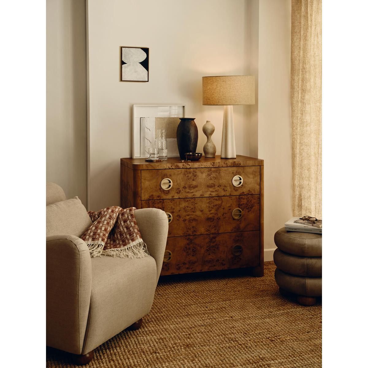 Inspired by Soho House Hong Kong, the Warwick chest of drawers is made from book-matched burl veneer with smoothed edges and rounded brass handles with recessed pull detail. The veneer sheets have been specially selected to mirror their exact position in the tree - this creates symmetry and enhances the clean design. Book-matched burl veneer chest of drawers Three dovetail drawers Smoothed edges Round handles with solid brass pull feature Veneer sheets selected to mirror the layout in the tree Inspired by Soho House Hong Kong