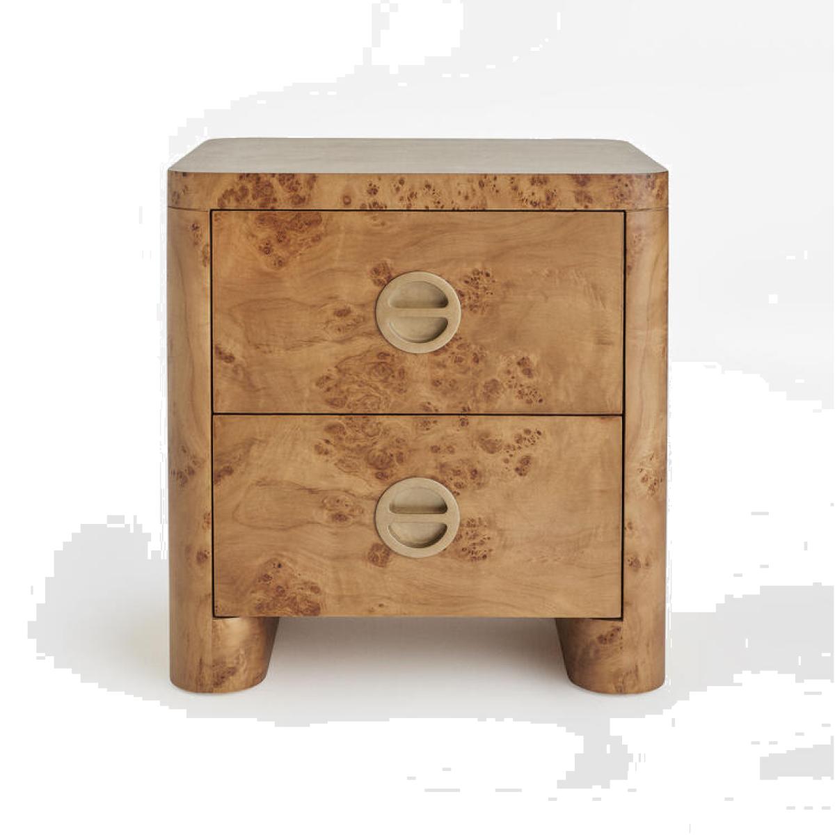 Inspired by Soho House Hong Kong, the Warwick bedside table is made from book-matched burl veneer with smoothed edges and rounded brass handles with recessed pull detail. The veneer sheets have been specially selected to mirror their exact position in the tree - this creates symmetry and enhances the clean design. • Book-matched burl veneer bedside table • Two dovetail drawers • Smoothed edges • Round handles with solid brass pull feature • Veneer sheets selected to mirror the layout in the tree • Inspired by Soho House Hong Kong