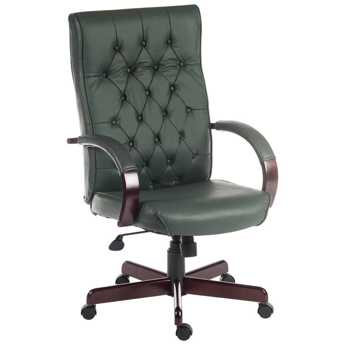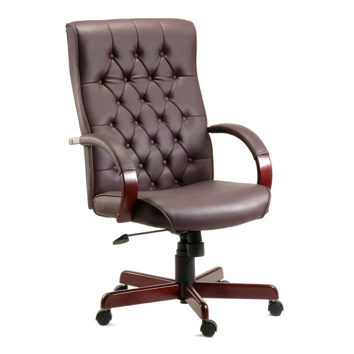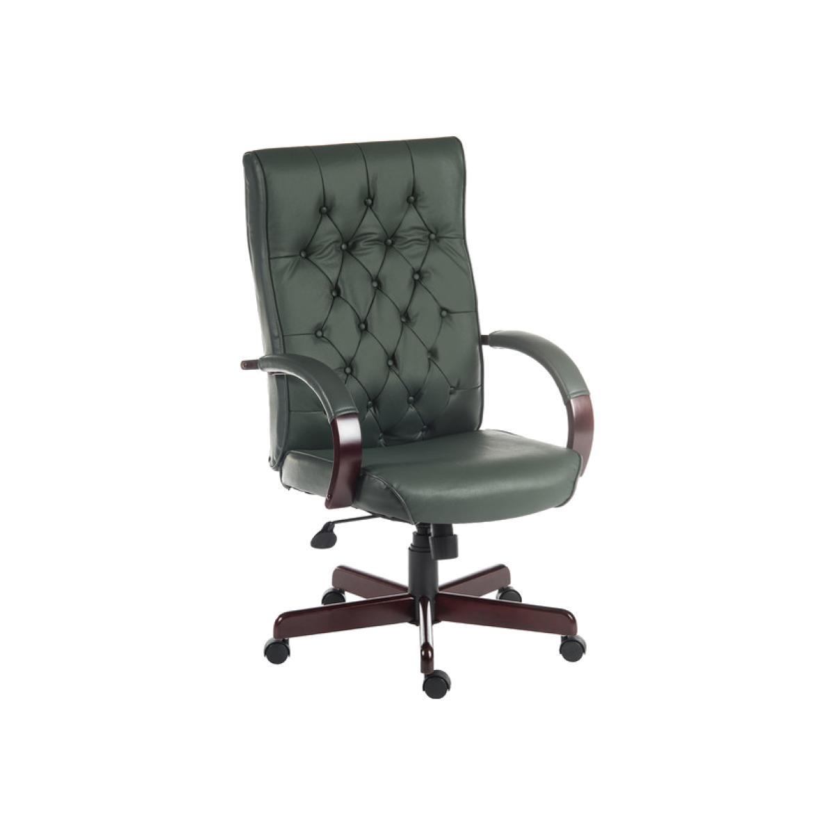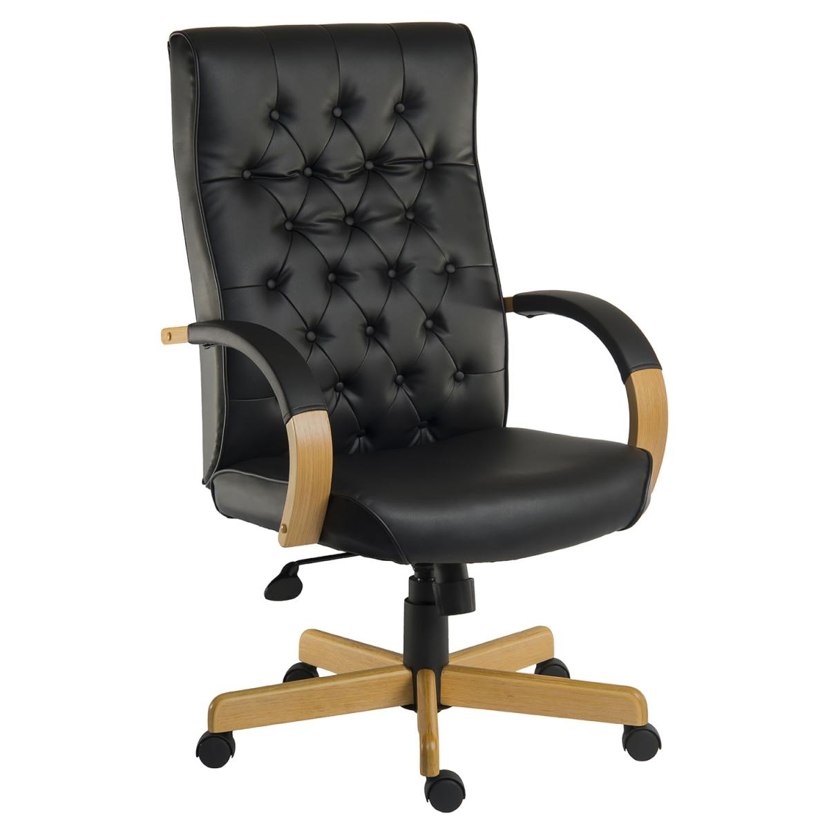 Beautifully crafted from bonded leather, this Warwick Executive Chair was designed with your comfort in mind. The sophisticated and luxurious office chair features a durable faux leather seat with a soft and supportive padding to give you luxury as you work. The padded back with its smart button tufted design is perfect for relaxing against while offering lumber support from its high rise. Connecting the back and seat are sturdy and stylish wooden armrests, adding to the comfortable nature of this office chair. The seat rests central on a metal constructed leg with five casters, making it easy to move around on and running smoothly over a variety of carpet textures and wooden flooring. The box tilt mechanism, swivel function and gas lift height adjustment makes it easy to alter the stature of the seat to how you wish, creating the perfect chair to use every day.