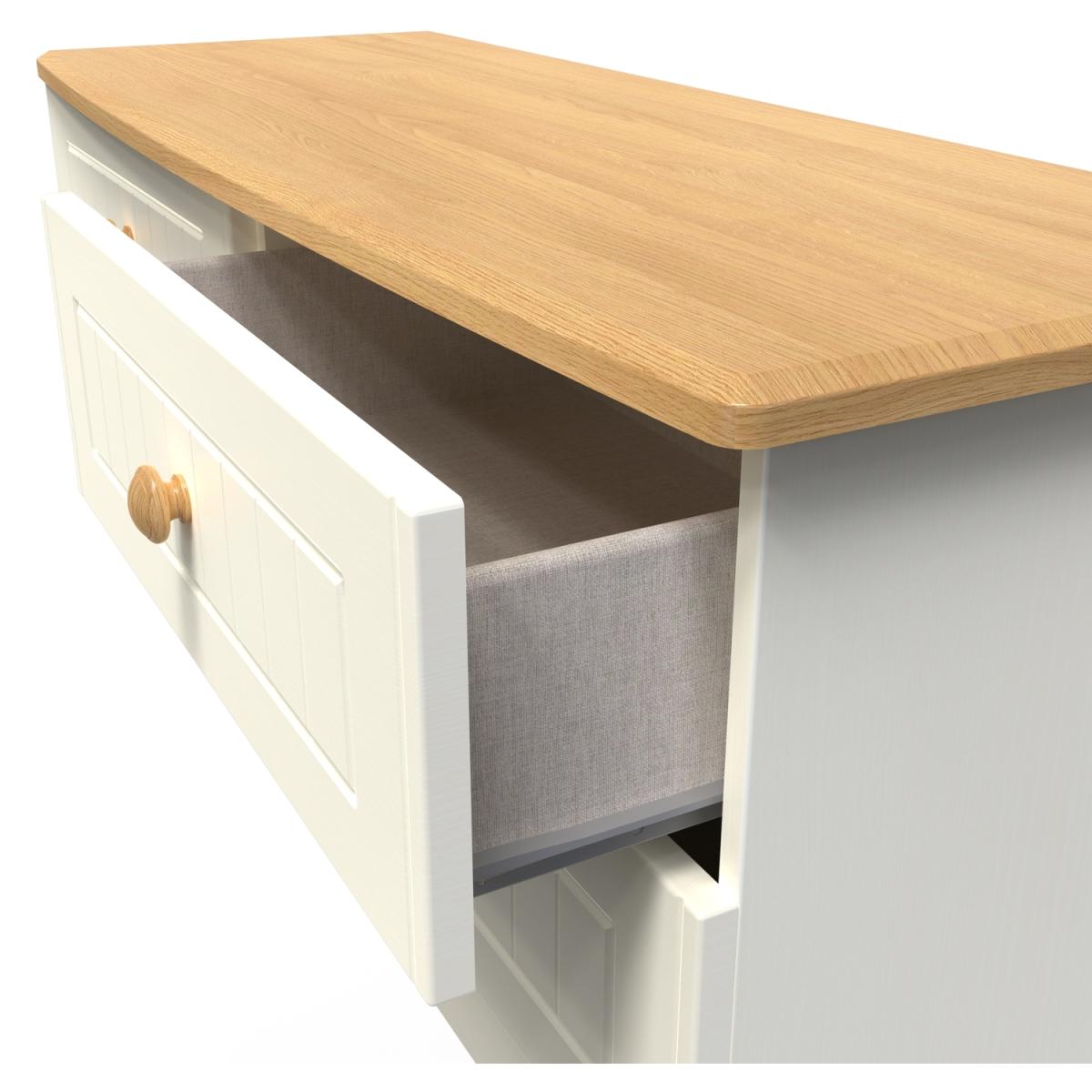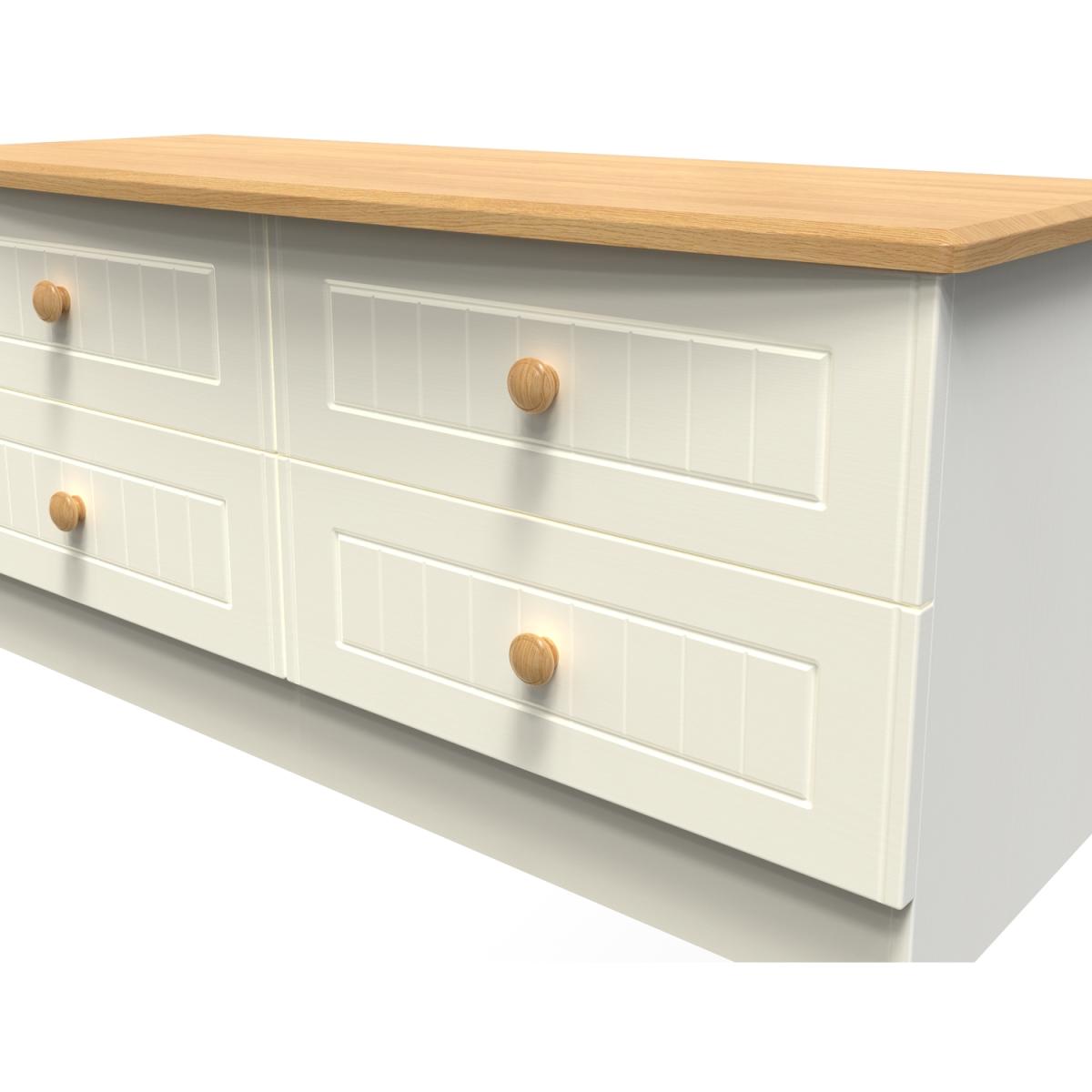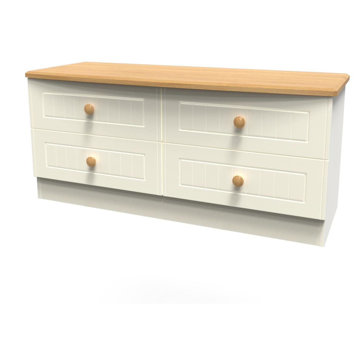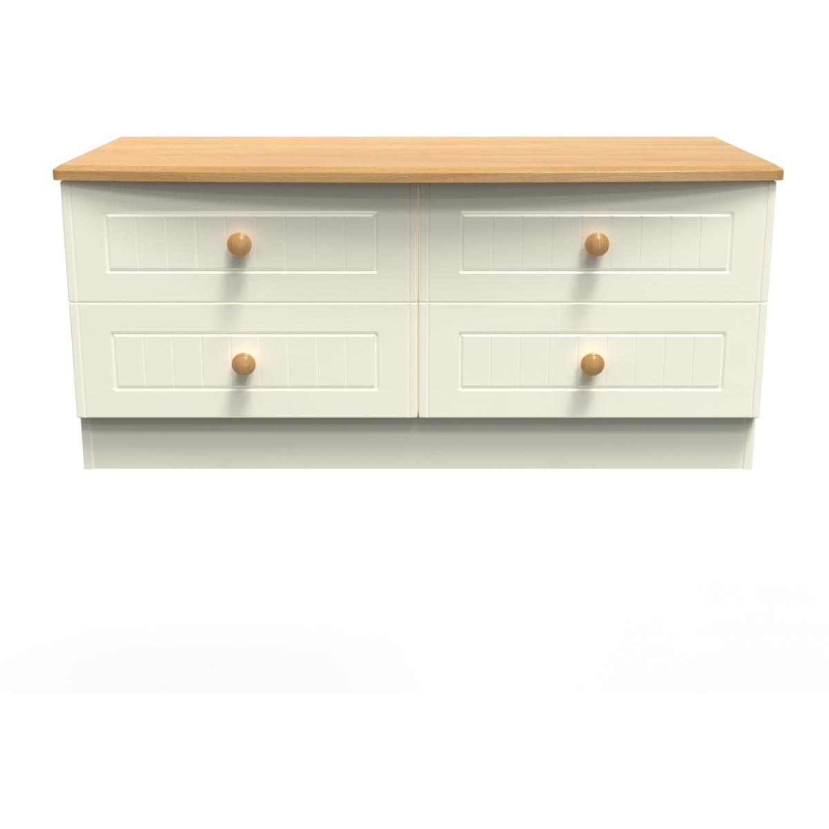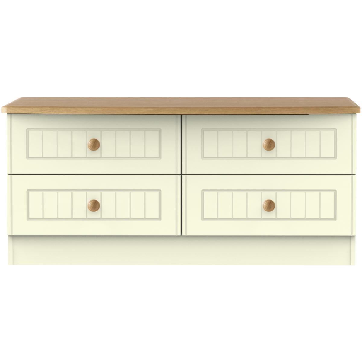 A large 4 drawer bed box. A Perfect storage solution for any room (not just the end of your bed). Could also be used as a low level TVMedia stand. The natural beauty of the Warwick bedroom range is complemented with curved tops and a variety of colour options. Enhanced by a delicate grooved design on all doors and drawers, with optional contrasting oak effect tops and handles this stunning bedroom range will suit any interior. All our furniture is made in the United Kingdom, to the highest quality. It is delivered direct to your location of choice by one of our two man delivery teams, and come full assembled (although legs may be removed to prevent damage in transit).
