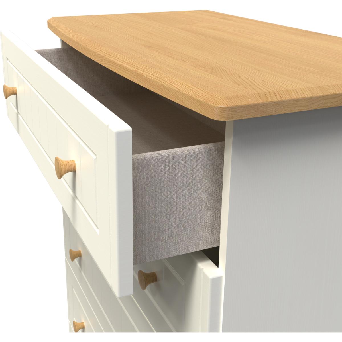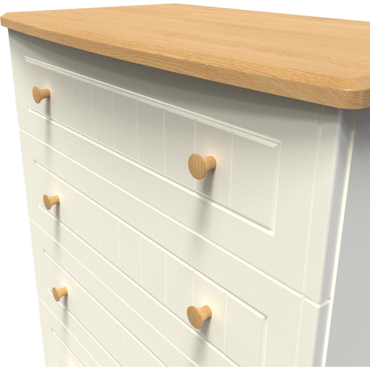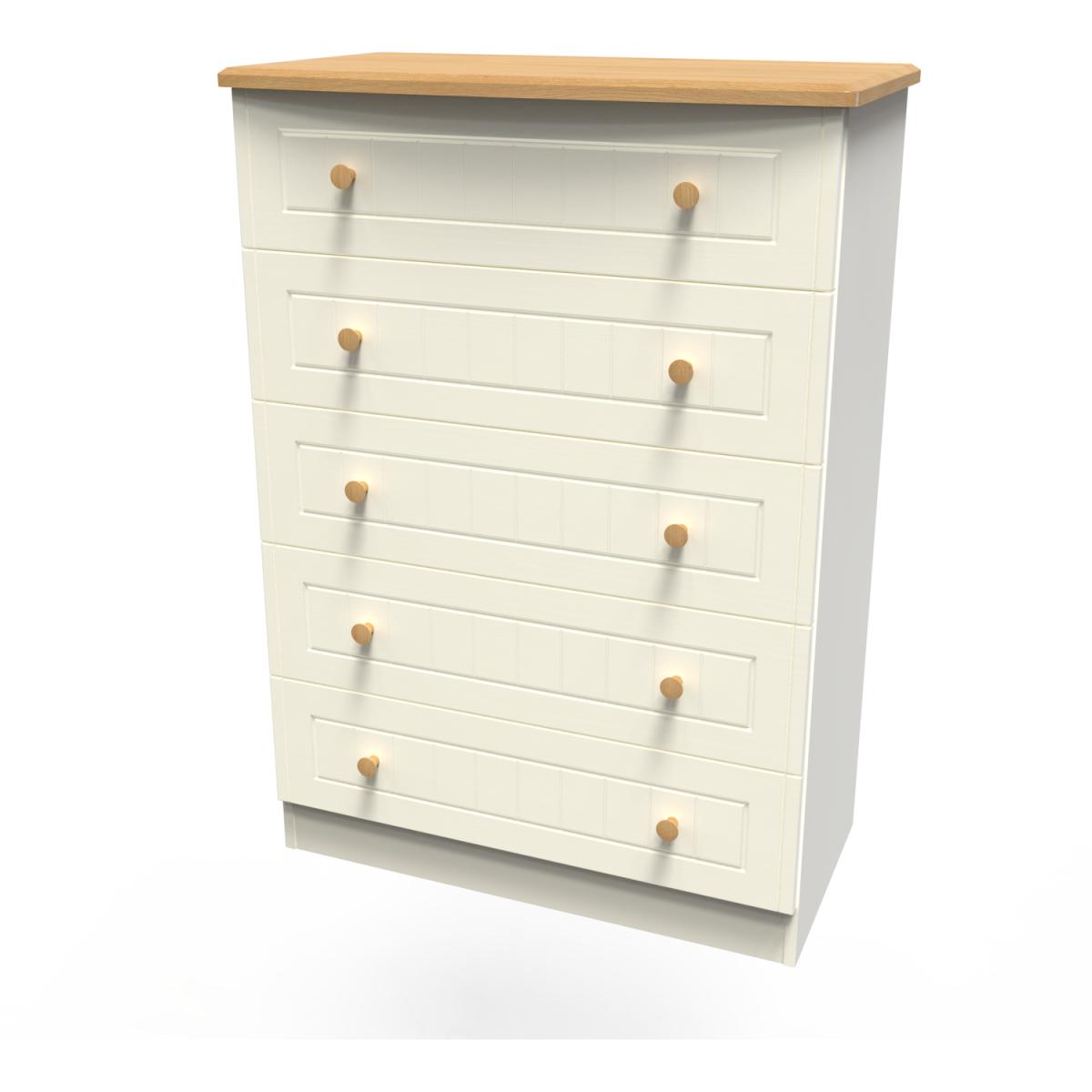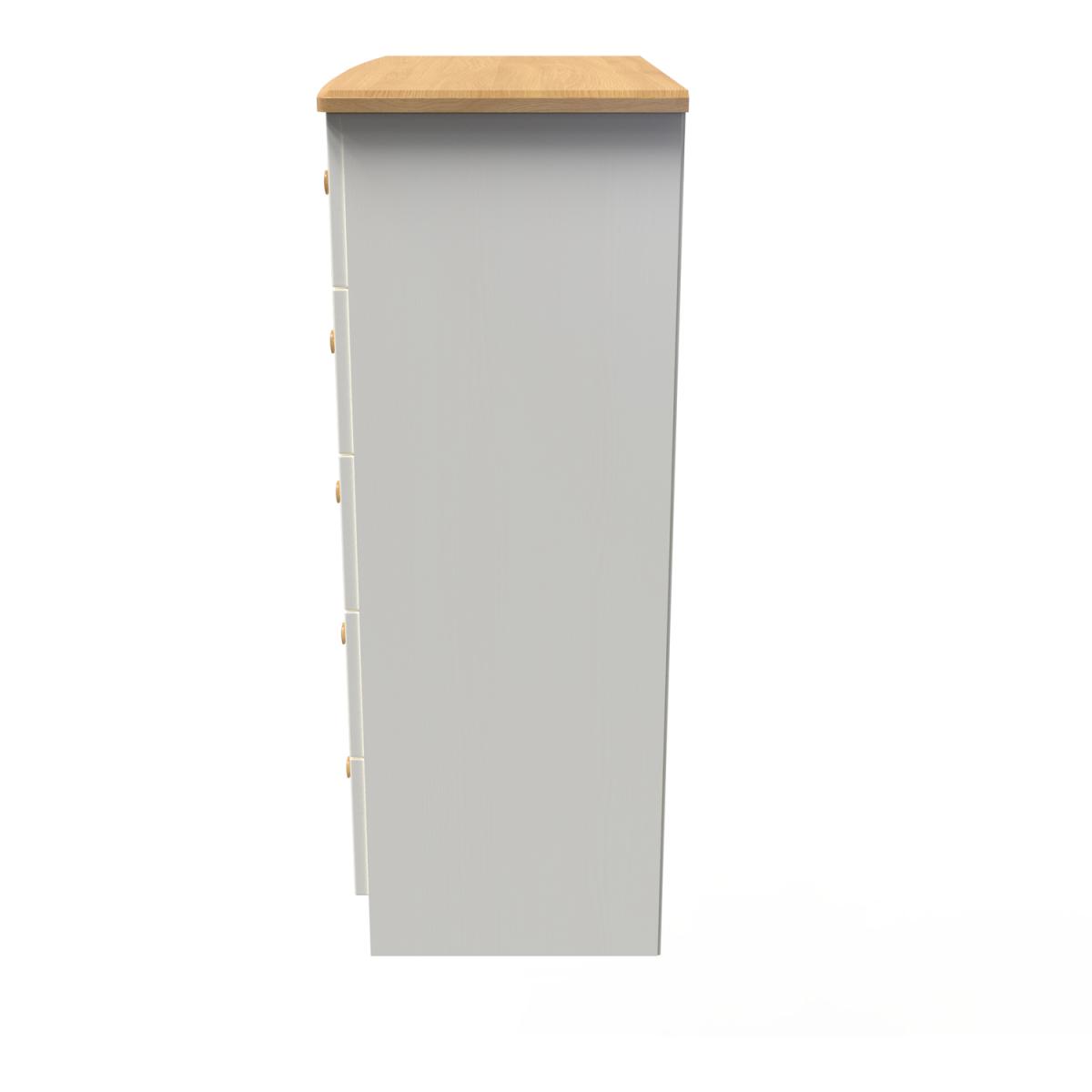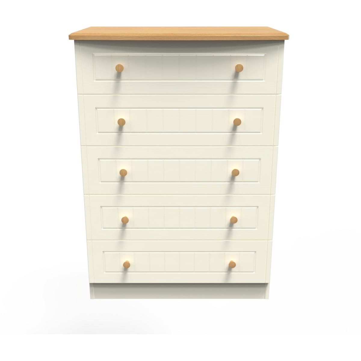 This wide 5 drawer chest of drawers is practical and stylish. Perfect for any home as a free standing storage unit. The natural beauty of the Warwick bedroom range is complemented with curved tops and a variety of colour options. Enhanced by a delicate grooved design on all doors and drawers, with optional contrasting oak effect tops and handles this stunning bedroom range will suit any interior. All our furniture is made in the United Kingdom, to the highest quality. It is delivered direct to your location of choice by one of our two man delivery teams, and come full assembled (although legs may be removed to prevent damage in transit).