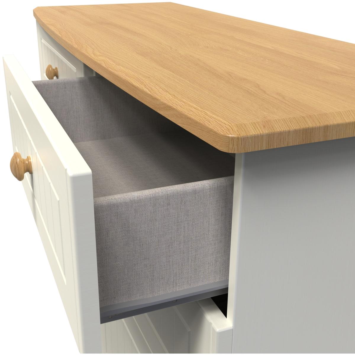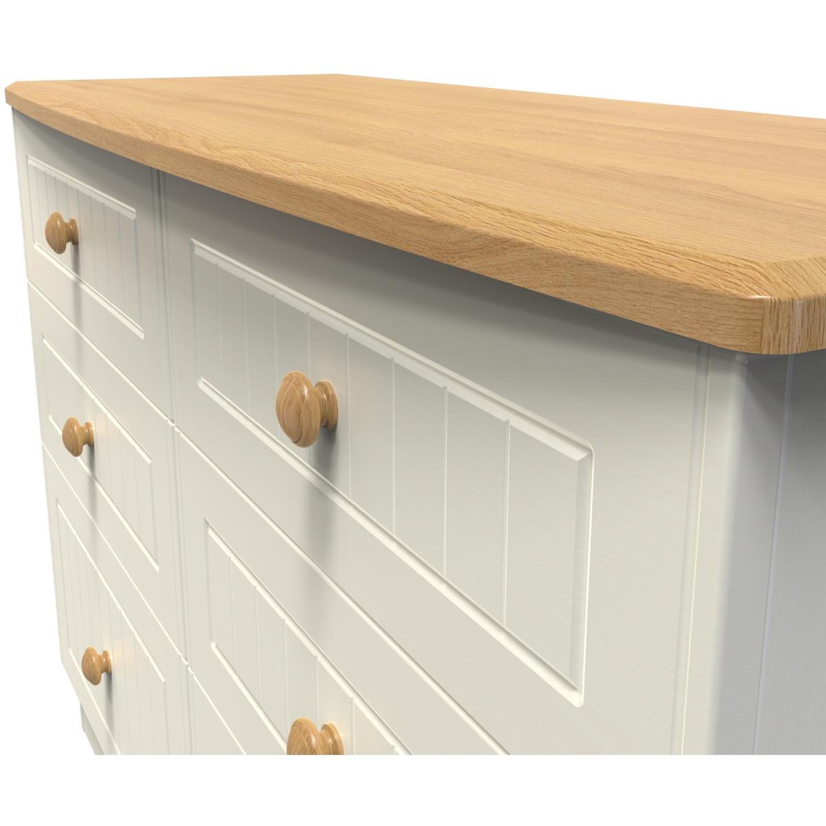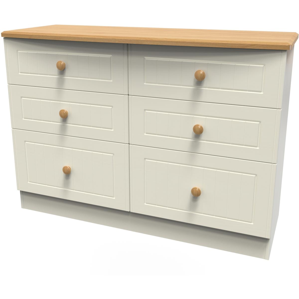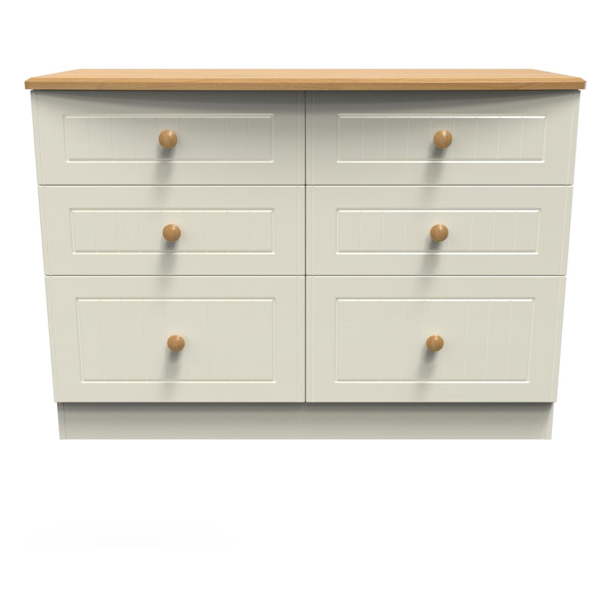 This double width 6 drawer chest of drawers is practical and stylish. Perfect for any home as a free standing storage unit. The natural beauty of the Warwick bedroom range is complemented with curved tops and a variety of colour options. Enhanced by a delicate grooved design on all doors and drawers, with optional contrasting oak effect tops and handles this stunning bedroom range will suit any interior. All our furniture is made in the United Kingdom, to the highest quality. It is delivered direct to your location of choice by one of our two man delivery teams, and come full assembled (although legs may be removed to prevent damage in transit).