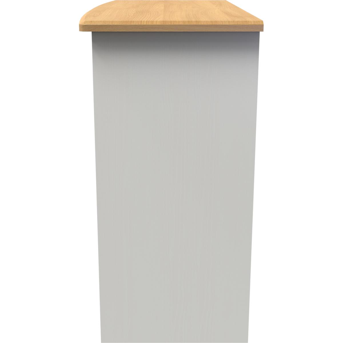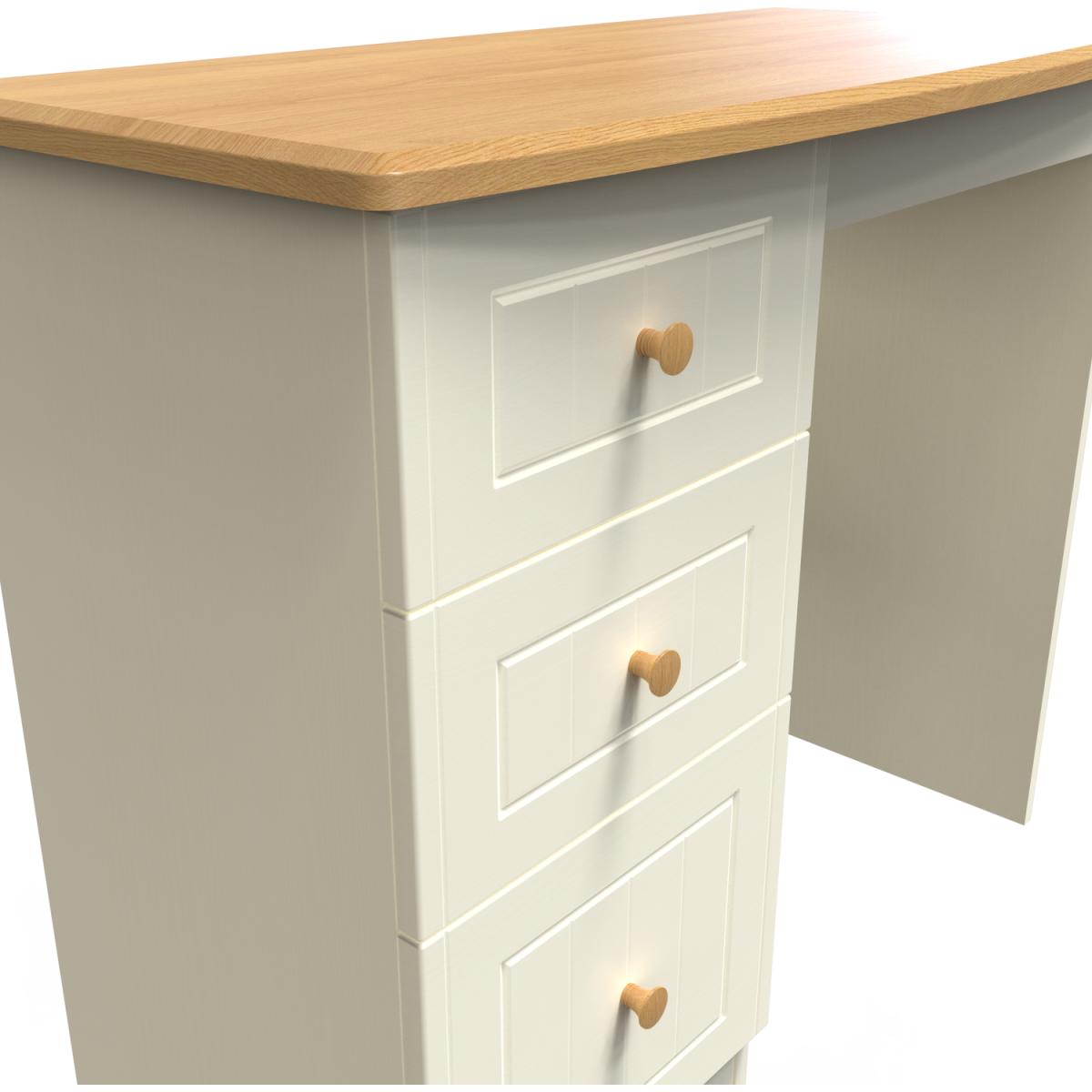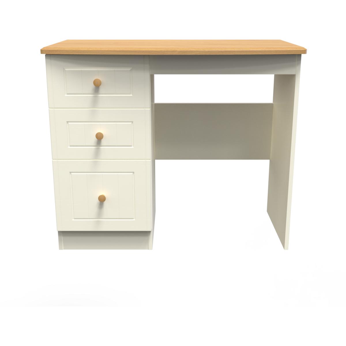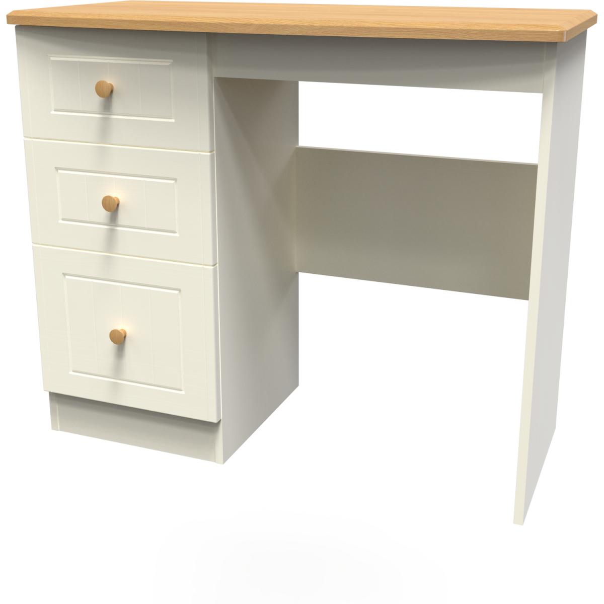 This practical 3 drawer narrow deskvanity is perfect for any bedroom or office. A matching stool and mirror (in 2 sizes) are also available. The natural beauty of the Warwick bedroom range is complemented with curved tops and a variety of colour options. Enhanced by a delicate grooved design on all doors and drawers, with optional contrasting oak effect tops and handles this stunning bedroom range will suit any interior. All our furniture is made in the United Kingdom, to the highest quality. It is delivered direct to your location of choice by one of our two man delivery teams, and come full assembled (although legs may be removed to prevent damage in transit).