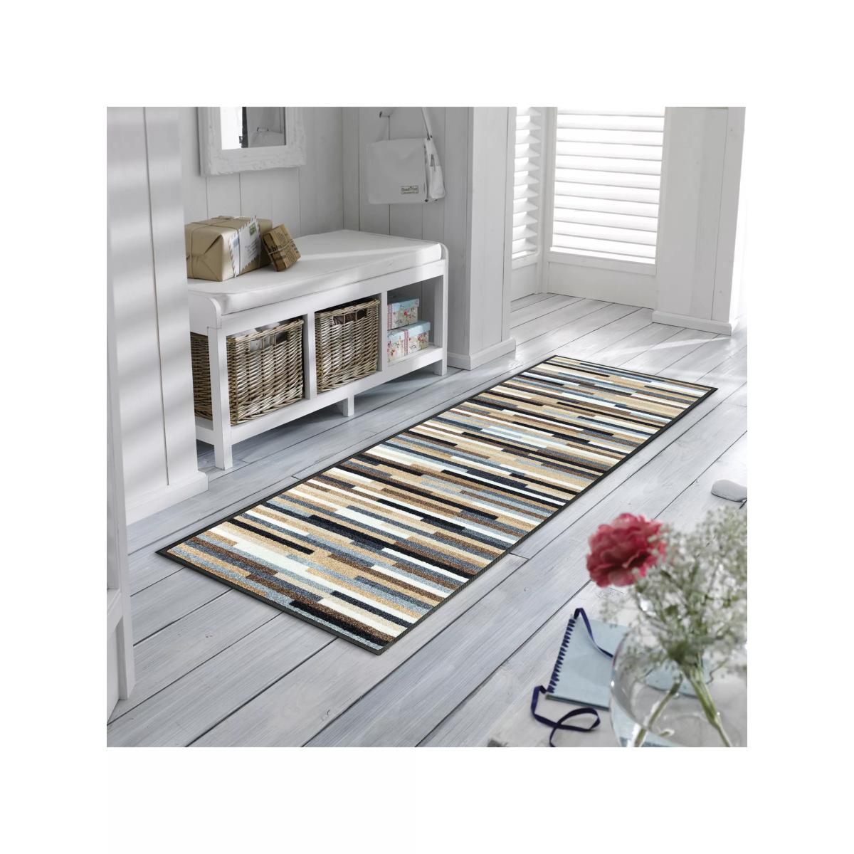 In an eye-catching, striped design, this door mat is ideal for allergy sufferers as it traps both pollen and dust. Slip resistant and PVC making it suitable for use in rooms with underfloor heating, this door mat absorbs impact and noise. Plus, its flat design means it fits under most doors. Care instructions "Before first use, wash your doormat separately according to the care label at 60 degrees and mild detergent. This straightens the fibres, activates the mat pile and smooths out any creases and folds caused by transport. Spin the mat on a low setting with approx. 800 revolutions. Put the mat in the dryer and select the "Easy care" or "Mixed fabric" programme. As an alternative to the dryer, you can also lay the mat out flat to dry. Please note the respective maximum load of your electrical appliances. Clean your doormat 3 to 4 times a year (or more often if it is heavily used).