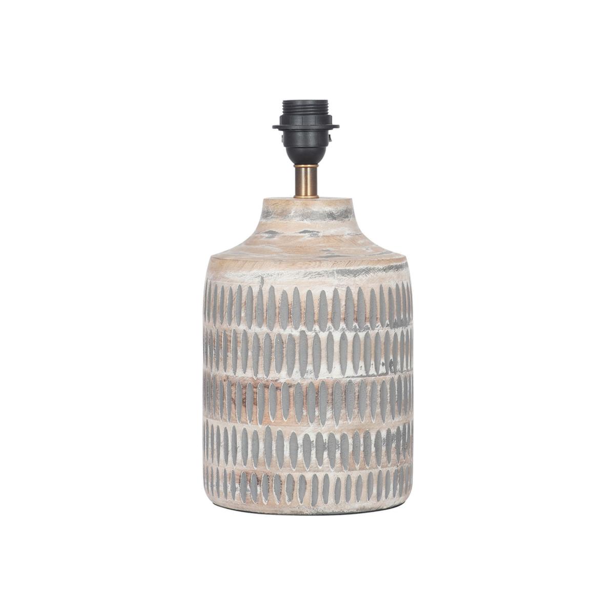 Finished in a grey wash this lamp gives a softer rustic style. Handcrafted in India, the base is made from mango wood and hand-carved with an organic stripe design giving each one a unique look. Finish with a neutral grey or ivory shade to create a coastal feel to your decor. Recommended lampshade size: 30cm diameter