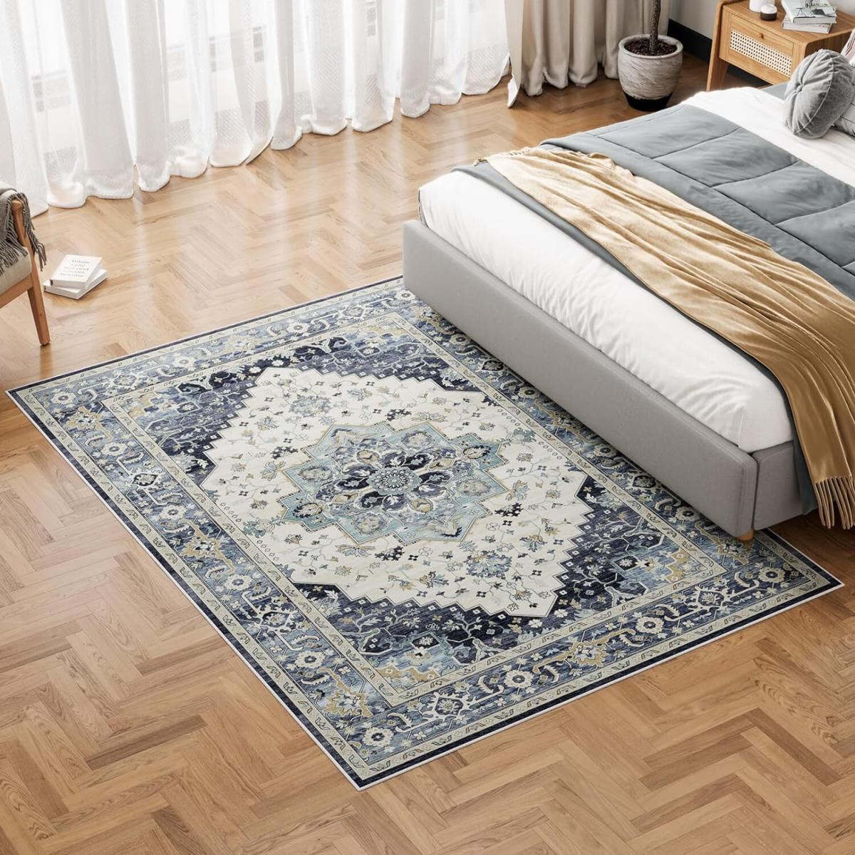 Washable rugs are easy to clean in the machine with cold water and mild detergent, saving you time and effort. Their low pile, stain, and water-resistant design handle spills and muddy paws, making them ideal for high-traffic areas. The durable rubber backing prevents slipping, while the soft polyester fibre offers comfort and is non-shedding. Lightweight and functional, these rugs are perfect for living rooms, bedrooms, dining areas, and kids' rooms. Eco-friendly with OEKO-TEX labels, they feature floral medallions for a vintage look that adds elegance to any space.