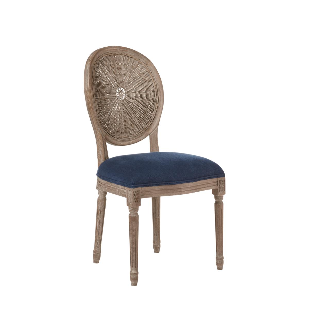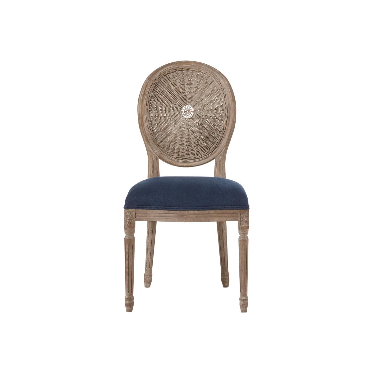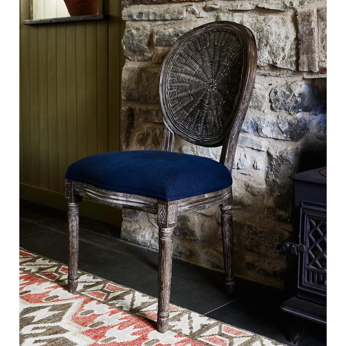 I love this chair because of its elegant blend of classic and contemporary style. The navy fabric seat offers a rich, versatile look that works well in both modern and traditional dining spaces. Its woven rattan back adds texture and natural warmth, making it a great choice for relaxed, coastal, or boho-inspired interiors. Practical styling tips include pairing it with a light wooden or neutral-toned table to let the navy pop, or layering with cushions for extra comfort. It’s a flexible piece that can elevate a variety of dining setups while maintaining a warm, inviting feel.