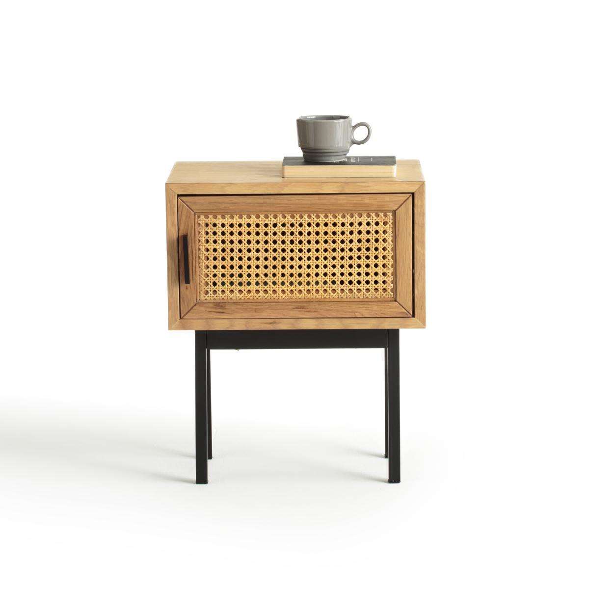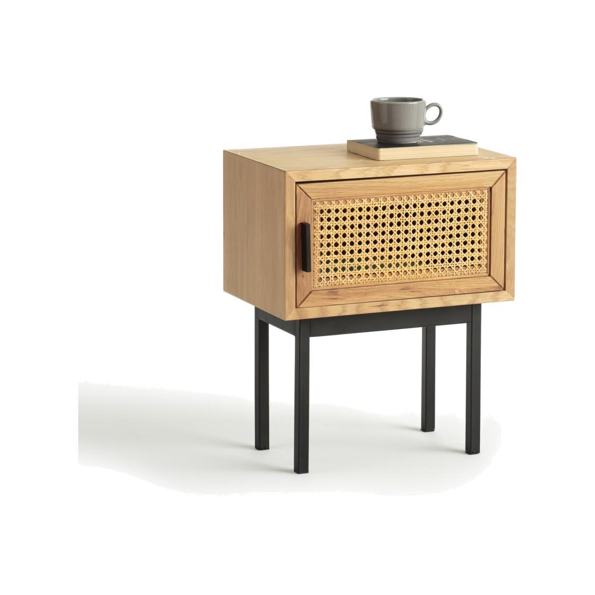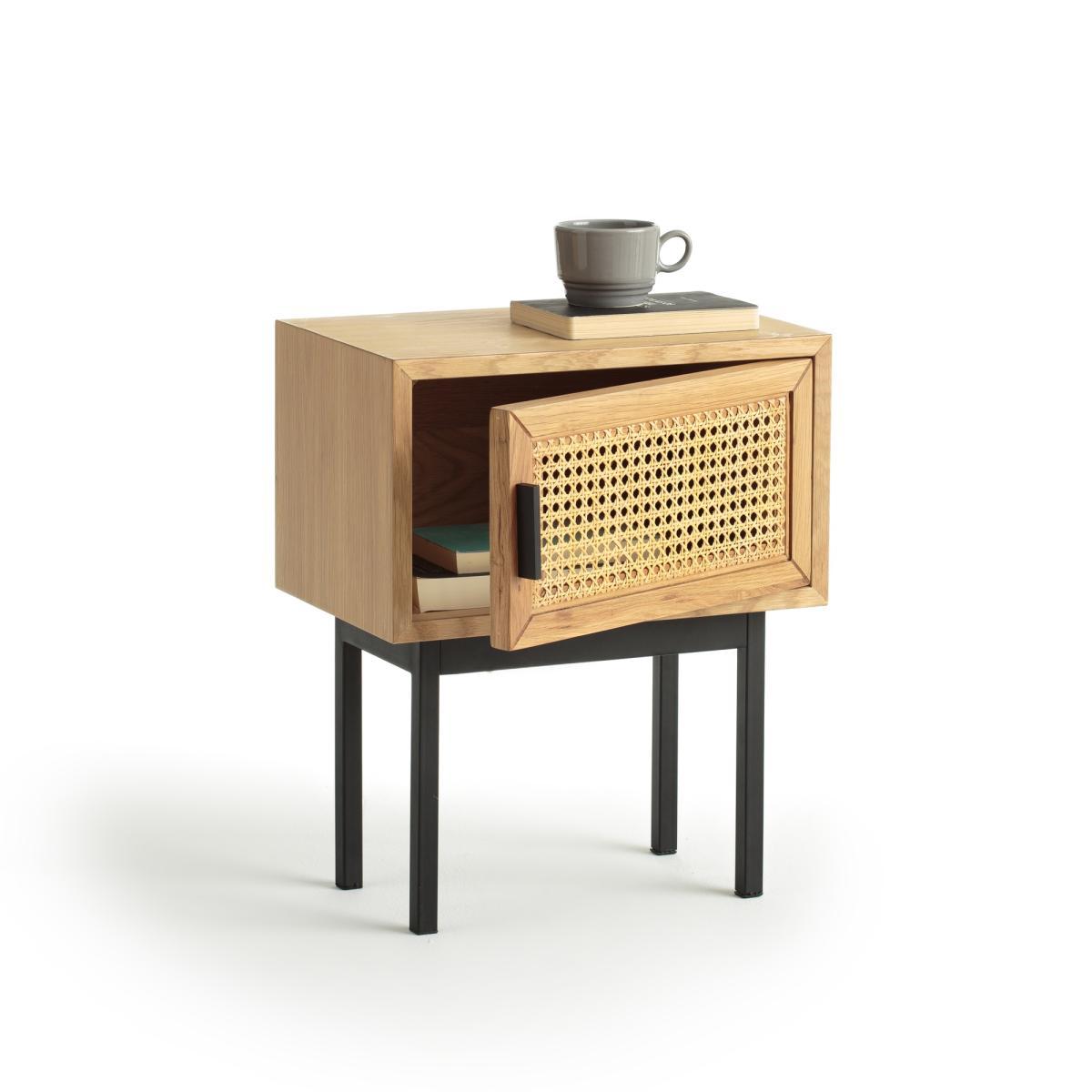 Compact, the Waska bedside table adopts an oak structure, a black metal base and a rattan cane door for a very successful design..