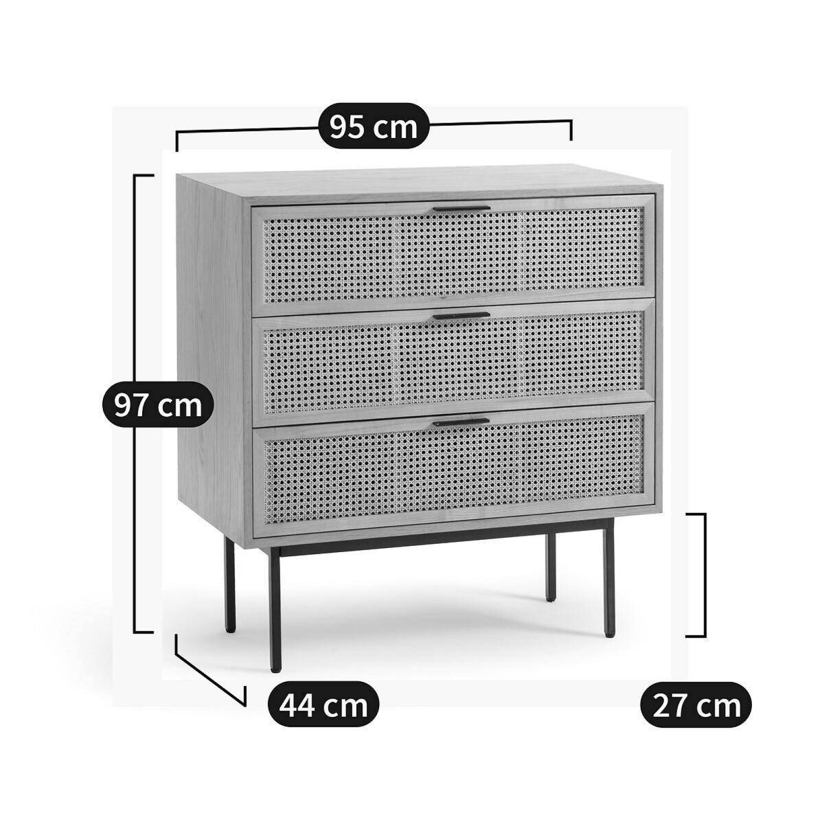 I love this chest because of its versatile, contemporary design with its natural wood finish and rattan-front drawers. It works particularly well in neutral, Scandi-inspired interiors or as a statement piece in more eclectic or boho spaces. Practical styling tips include using it in a bedroom for organised storage or in a living area as a side table with decorative accessories on top. Its clean lines and understated character make it easy to pair with a variety of colour schemes and furnishings, while the rattan detailing adds texture and visual interest without overpowering the space. To maximise its potential, consider keeping the rest of the decor simple and adding colour through textiles and accessories.
