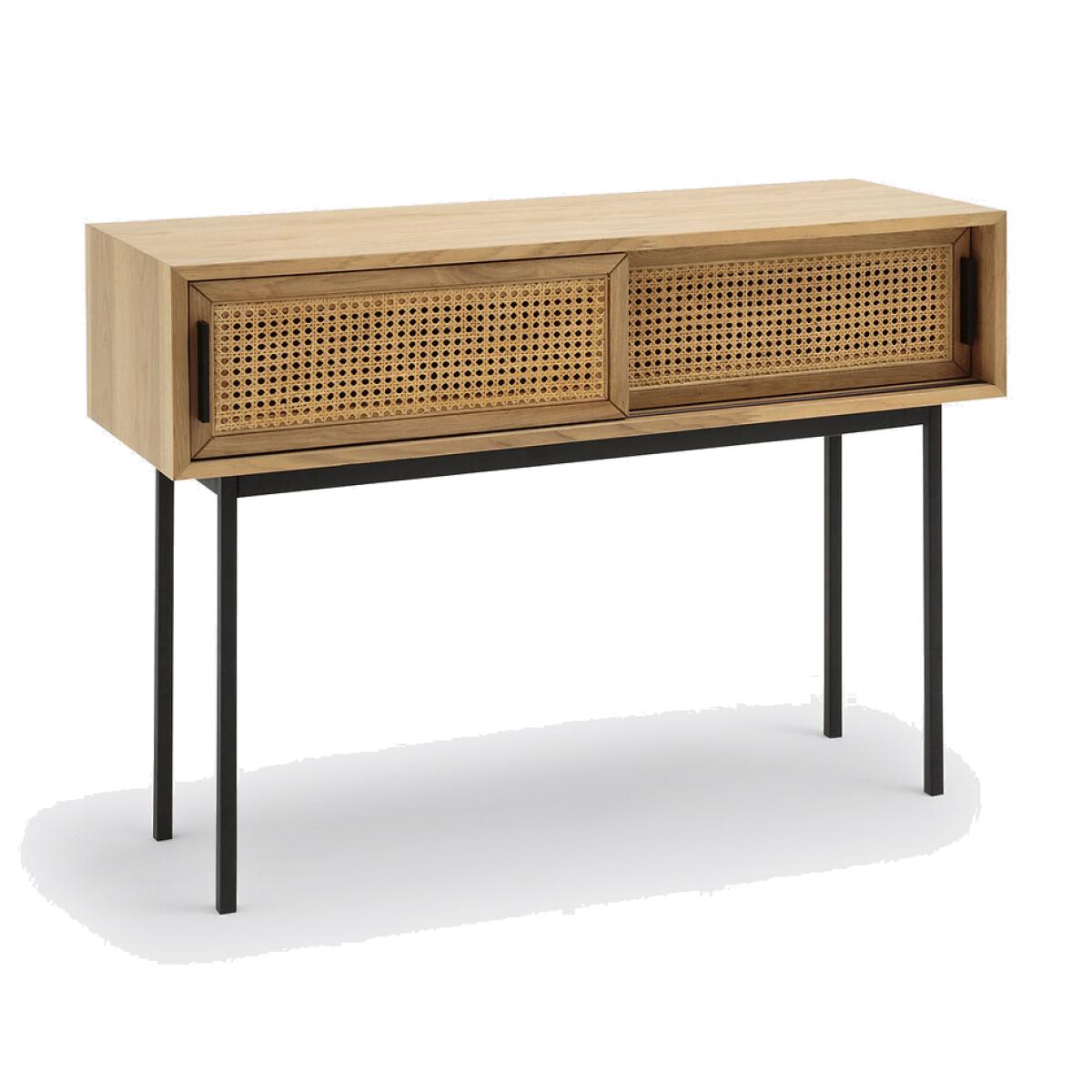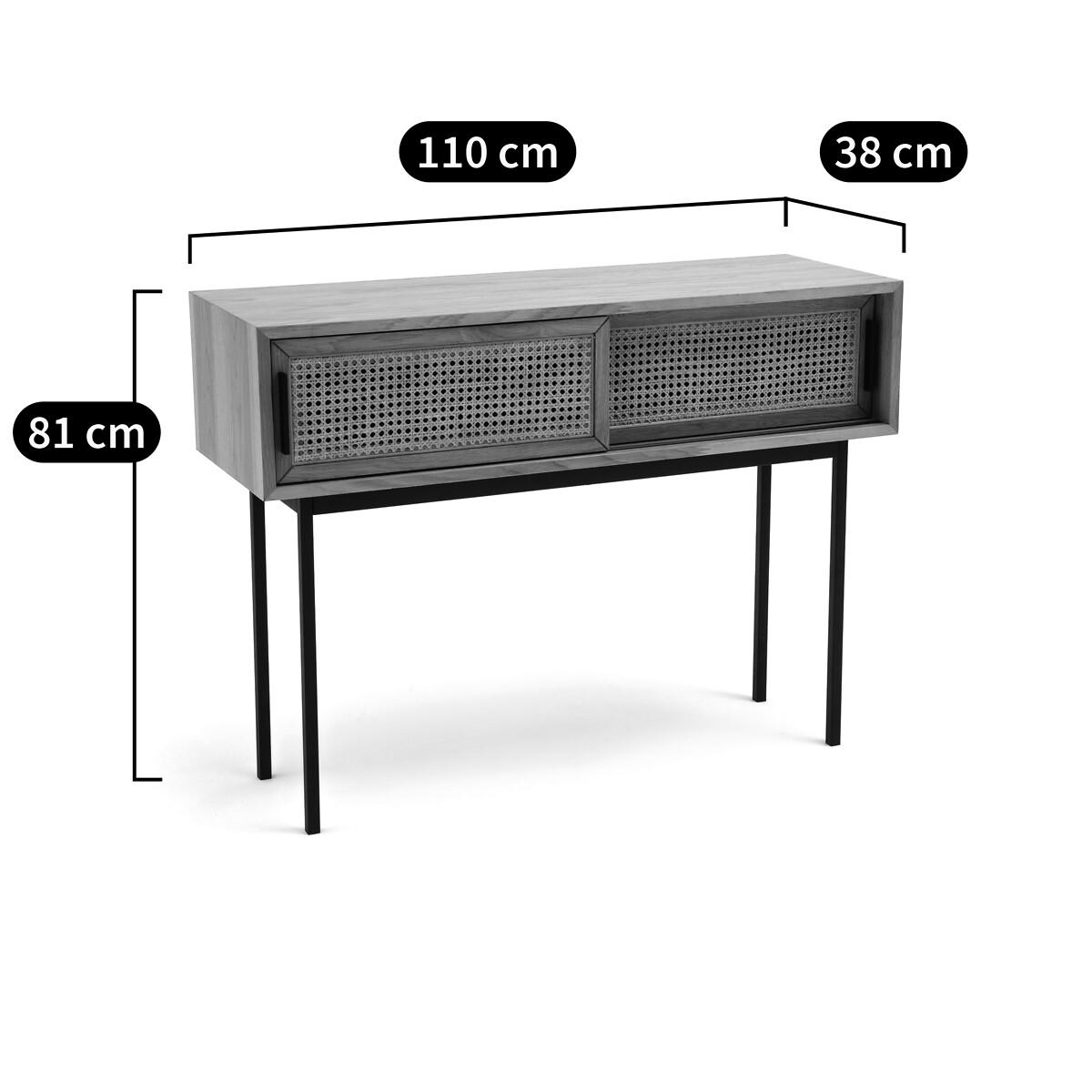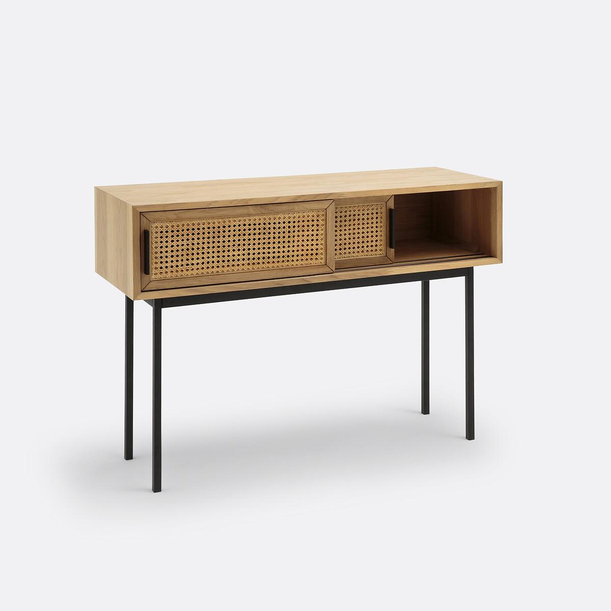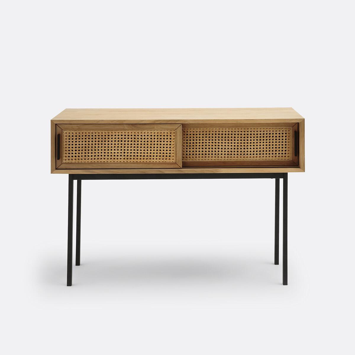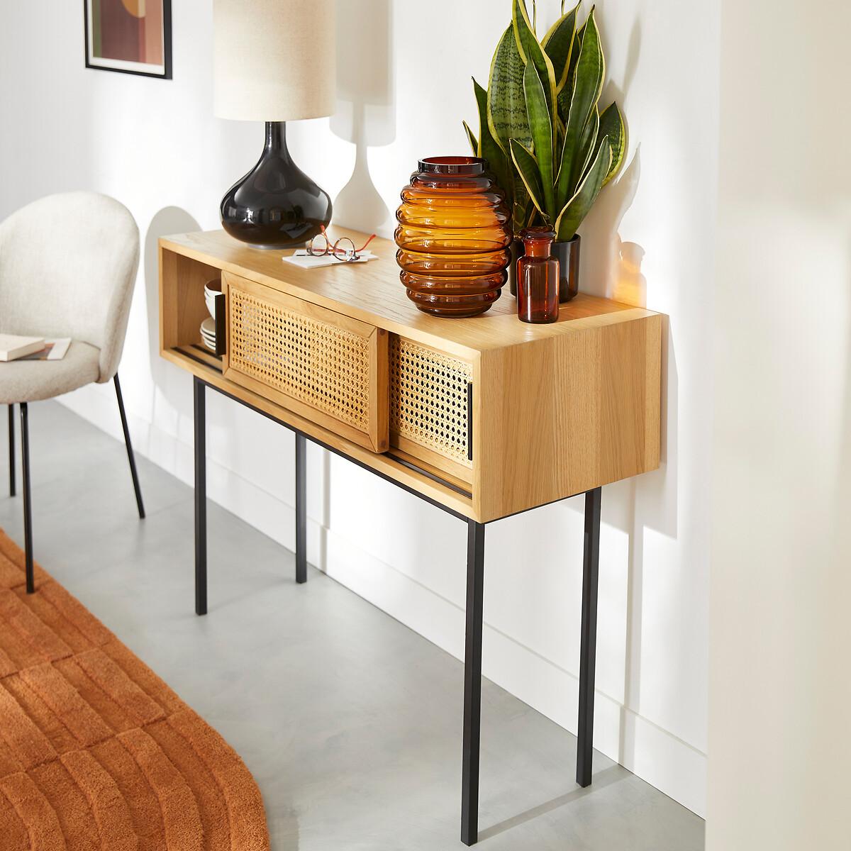 A traditional console reinterpreted with a contemporary design. Waska is an exclusive creation signed by our in-house designers. This timeless piece of furniture is one of our customers' favourites. Inspired by Scandinavian design, it combines caning, oak and metal. Its clean lines allow it to fit into any interior, modern or classic.. Beautiful and functional. Product Details • Pre-assembled unit in oak and oak-veneered MDF, nitrocellulose varnish finish • Oak door frames and rattan canework facade • Feet and handles in black painted steel, epoxy finish • Fixes to the wall • Plastic glides for 2 sliding doors • Inside: 1 vertical divider, 2 niches. Dimensions • Length: 110cm • Depth: 38cm • Height: 81cm • Usable size of compartments : L52 x H22 x D31cm. • Assembly required. • WOOD FROM MORE SUSTAINABLY MANAGED FORESTS AND CONTROLLED SOURCES. FSC® Mix wood contains at least 70% FSC® certified and/or recycled wood, the remainder being FSC® controlled wood. Parcel Dimensions:1 parcel • L118 x D45 x H38cm. 27.5kg