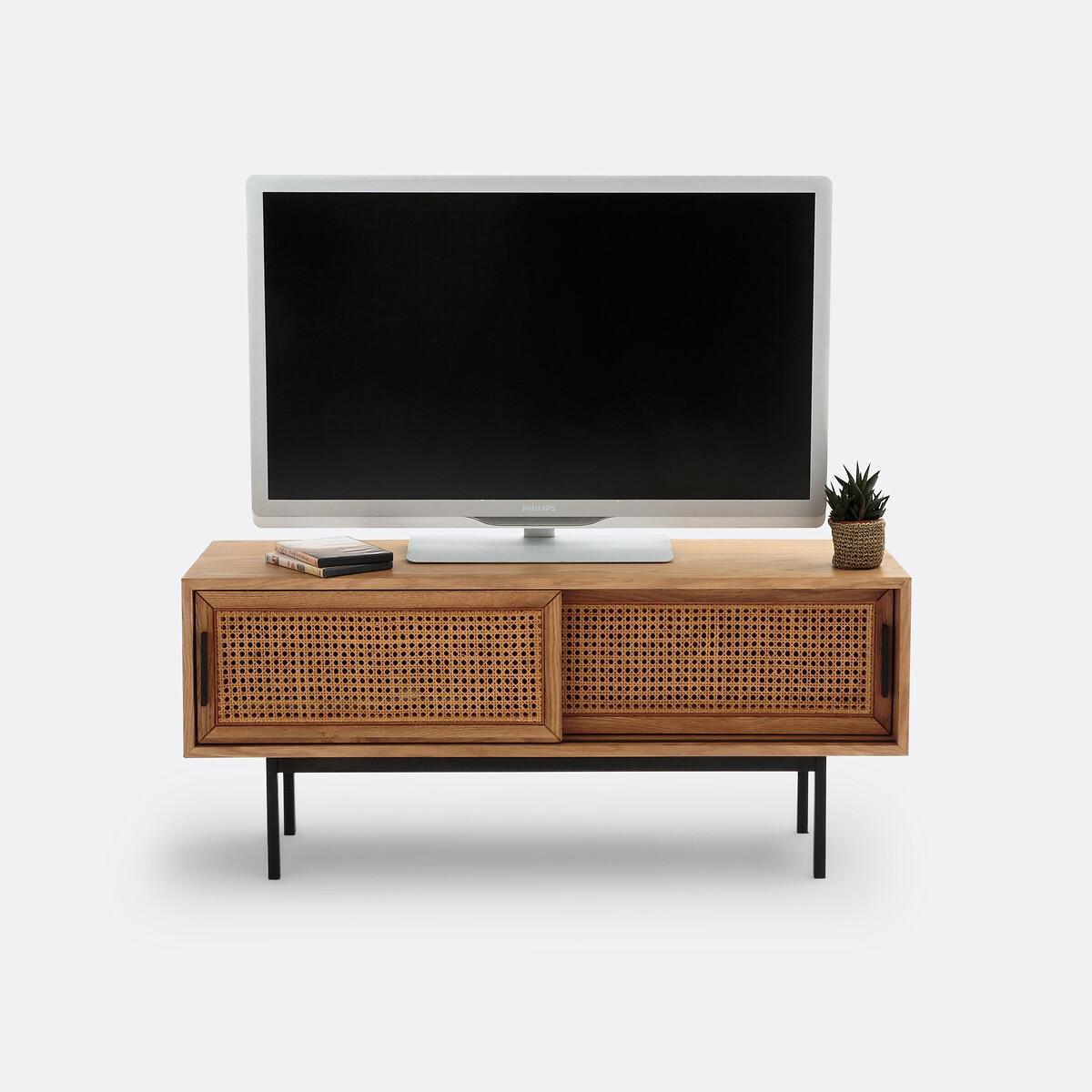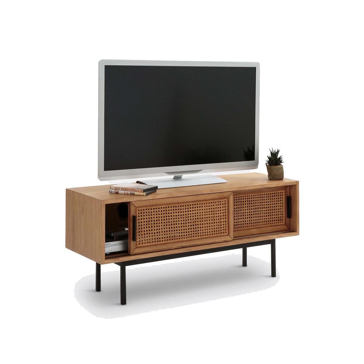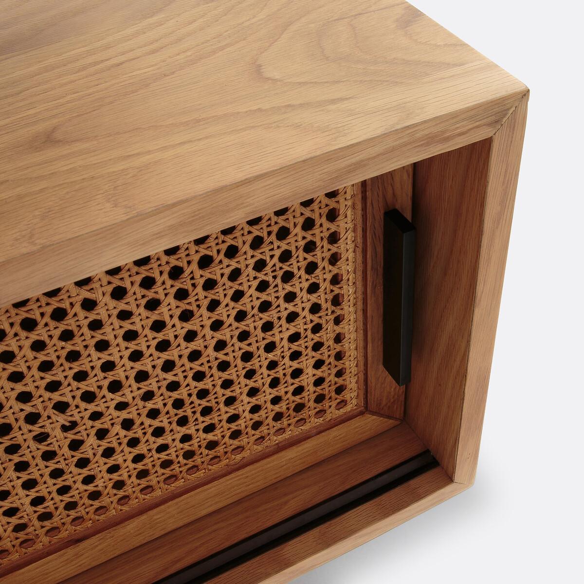 A reinvented TV bench, in a contemporary style. Waska is an exclusive creation signed by our in-house designers. This timeless piece of furniture is one of our customers' favourites. Inspired by Scandinavian design, it combines caning, oak and metal. Its clean lines allow it to fit into any interior, modern or classic.. Beautiful and functional. Product Details • Oak frame. Rattan cane frontage • Structure in oak and MDF, oak veneer, nitrocellulose varnish finish • Metal legs and handles with black epoxy finish • 2 sliding doors • 2 large compartments with vertical divider • Pre-assembled cabinet, doors and legs to attach at home, instructions enclosed. Dimensions • Length: 120cm • Height: 52cm • Depth: 38cm • Height of legs: 22cm • Height of unit: 30cm. Usable size of compartments : • Length 56.5cm • Height 26cm • Depth: 30cmDelivery:. Sold with feet to be attached. Parcel dimensions and weight: • 125 x 44 x 42cm • 29kg