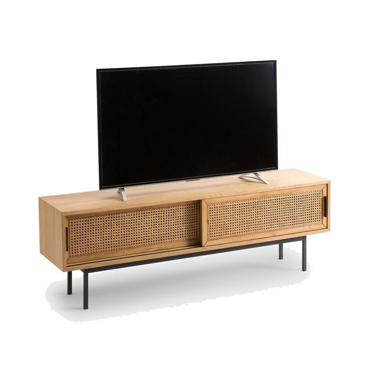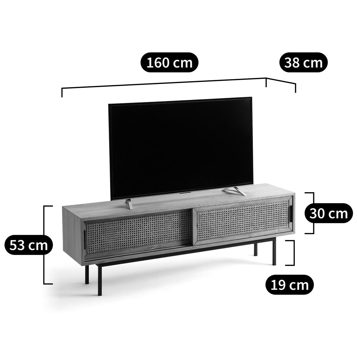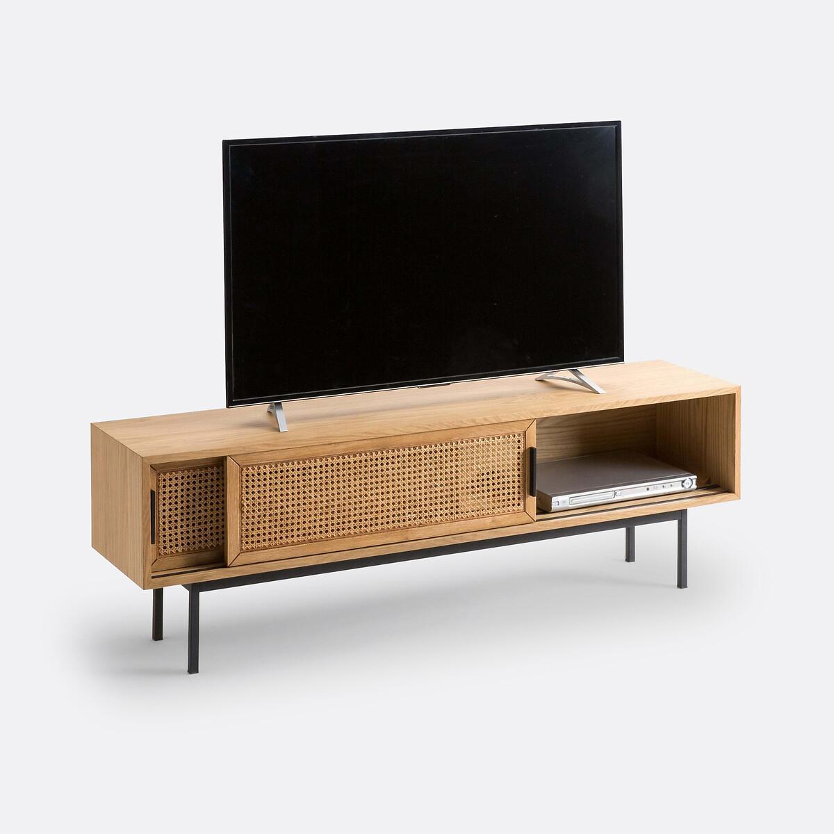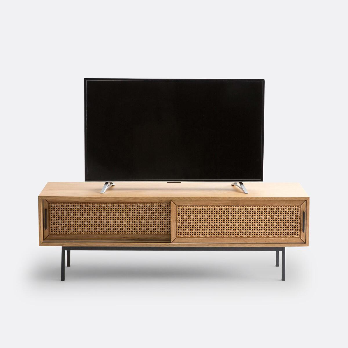 A reinvented TV cabinet, in a contemporary style. Waska is an exclusive creation signed by our in-house designers. This timeless piece of furniture is one of our customers' favourites. Inspired by Scandinavian design, it combines caning, oak and metal. Its clean lines allow it to fit into any interior, modern or classic.. Beautiful and functional. Product Details • Solid oak door frame • Rattan cane frontage • Structure in solid oak and MDF with oak veneer, nitrocellulose varnish finish • Feet and handles in steel, black epoxy finish paint • 2 sliding doors • 2 large niches with 1 vertical separator • Pre-assembled unit, doors to be fixed and feet to be mounted, instructions attached • Cable management holes • Plastic pads on feet • Max screen size 145 cm. Dimensions • L160 x H53 x D38cm • Height of legs: 19cm • Height of unit: 30cm • Usable size of compartments : L78 x H26 x D29cm. Home Delivery. Your Waska TV stand is supplied pre-assembled (excluding legs). It will be delivered to your door! Note! Please check that all access points are large enough to accommodate your delivery (doors, stairs, lifts). • WOOD FROM MORE SUSTAINABLY MANAGED FORESTS AND CONTROLLED SOURCES. FSC® Mix wood contains at least 70% FSC® certified and/or recycled wood, the remainder being FSC® controlled wood. Parcel Dimensions1 parcel • L165 x H40 x D45cm, 39kg