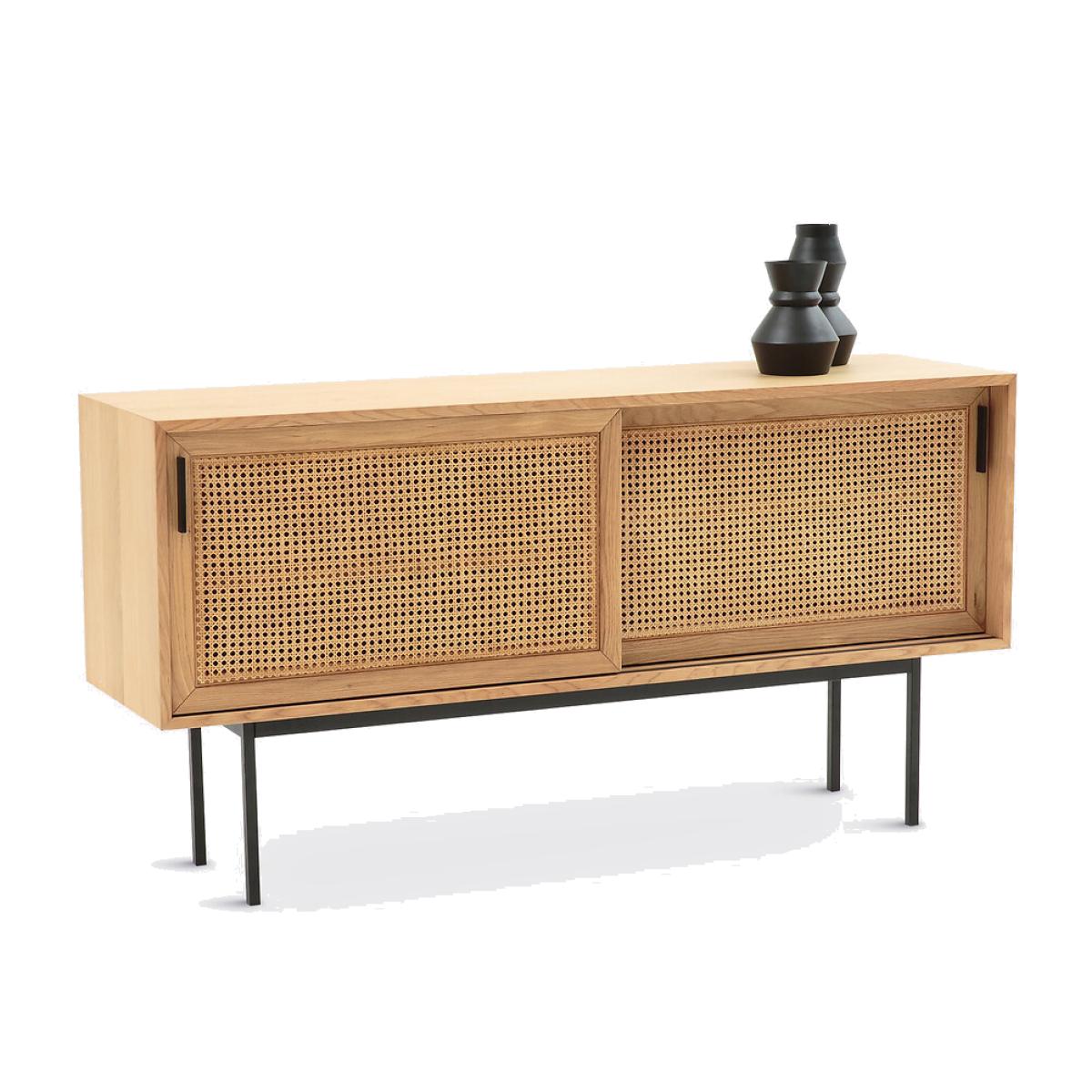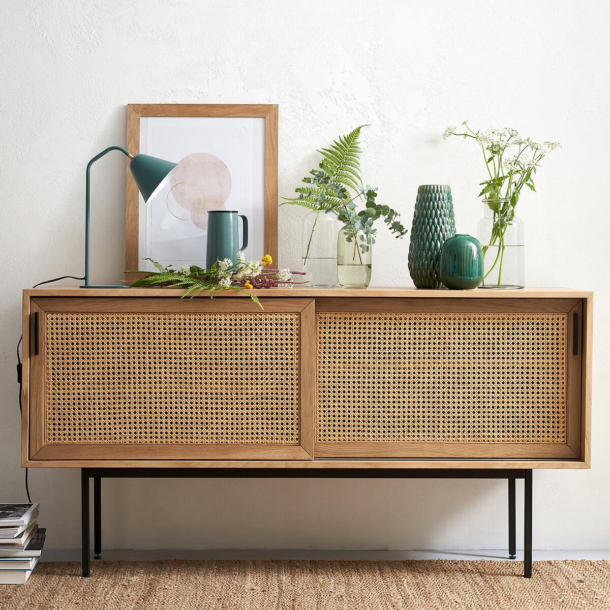 The sideboard reinterpreted, in a contemporary line. Inspired by Scandinavian design, it combines caning, oak and metal. Its clean lines allow it to fit into any interior, modern or classic..Both beautiful and functional. An exclusive creation by our in-house designers. Product Details • Oak frame • Rattan cane frontage • Solid oak doors and MDF oak veneer structure, nitrocellulose varnish finish • Metal legs and handles with black epoxy finish • 2 sliding doors • 2 fixed shelves, 1 vertical divider, 4 compartments • Pre-assembled unit, doors to be fixed and feet to be mounted, instructions attached. Dimensions • Width: 160cm • Height: 82cm • Depth: 43cm • Height of legs: 32cm • Height of unit: 50cm • Usable size of compartments : L77 x H25 x D35cm (x 2 compartments) et L77 x H18 x D35cm(x 2 compartments). • Sold with feet to be attached. • WOOD FROM MORE SUSTAINABLY MANAGED FORESTS AND CONTROLLED SOURCES. FSC® Mix wood contains at least 70% FSC® certified and/or recycled wood, the remainder being FSC® controlled wood. Parcel Dimensions • L167 x H62 x D50cm • 57.5kg