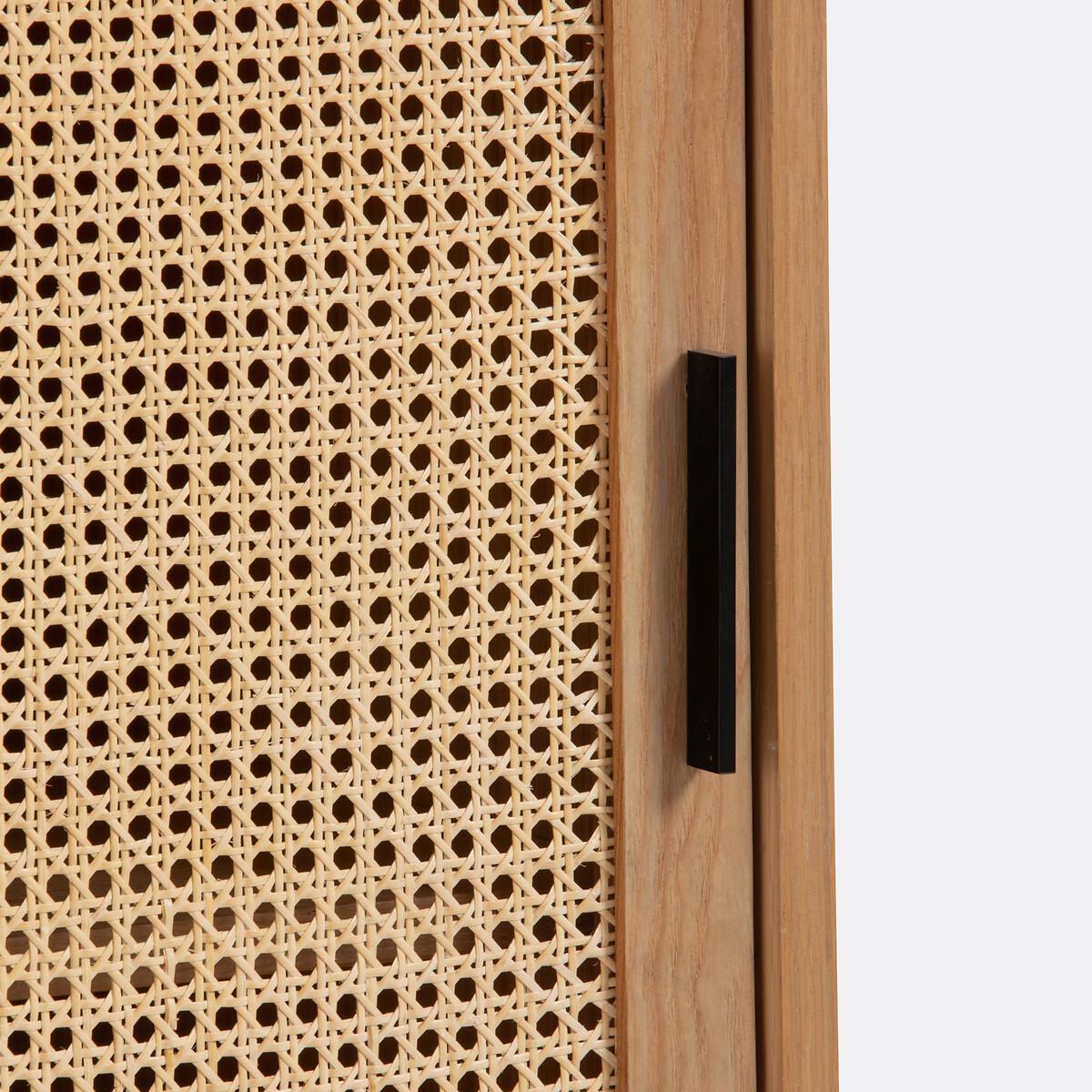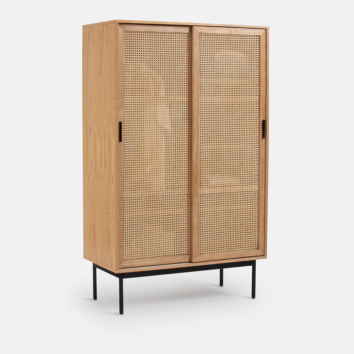 With its 2 doors covered in rattan cane, the Waska wardrobe is distinguished by simple lines that are firmly rooted in the vintage trend. Refined and elegant, it will add character to your home. Product Details • 2 sliding doors • On the left: 1 wardrobe with 1 fixed shelf at the bottom • On the right: 3 shelves: 2 adjustable in height and 1 fixed at the bottom • Unit and shelves in oak veneered MDF, nitrocellulose varnish finish • Solid ash door structure, canework facades, nitrocellulose varnish finish • FSC® certified wood • Base, handles, rails and hanging rod in black epoxy-finish metal, matte effect • Polypropylene glidesDimensions. Total • Width: 108cm • Height: 180cm • Depth: 55cm. Usable dimensions • Base height: 27cm • Chest of drawers section height: 153cm • Usable depth in each compartment: 47cm • Usable width in each compartment: 51.5cm • Height of hanging section: 101cm • Bottom shelf height: 32cmDelivery:. Assembly required. It will be delivered to your home!Note! Please check that all access points are large enough to accommodate your delivery (doors, stairs, lifts). • WOOD FROM SUSTAINABLY MANAGED FORESTS. FSC® certified wood comes from forests that are environmentally, socially and economically well managed. Dimensions and weight of parcel2 parcels • L120 x H25 x D66cm, 36kg • L161 x H19 x D67cm, 54kg