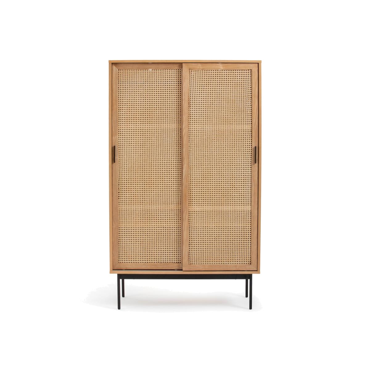 With its 2 doors covered in rattan cane, the Waska wardrobe is distinguished by simple lines that are firmly rooted in the vintage trend. Refined and elegant, it will add character to your home. Product Details • 2 sliding doors • On the left: 1 wardrobe with 1 fixed shelf at the bottom • On the right: 3 shelves: 2 adjustable in height and 1 fixed at the bottom • Unit and shelves in oak veneered MDF, nitrocellulose varnish finish • Solid ash door structure, canework facades, nitrocellulose varnish finish • FSC® certified wood • Base, handles, rails and hanging rod in black epoxy-finish metal, matte effect • Polypropylene glidesDimensions. Total • Width: 108cm • Height: 180cm • Depth: 55cm. Usable dimensions • Base height: 27cm • Chest of drawers section height: 153cm • Usable depth in each compartment: 47cm • Usable width in each compartment: 51.5cm • Height of hanging section: 101cm • Bottom shelf height: 32cmDelivery:. Assembly required. It will be delivered to your home!Note! Please check that all access points are large enough to accommodate your delivery (doors, stairs, lifts). • WOOD FROM SUSTAINABLY MANAGED FORESTS. FSC® certified wood comes from forests that are environmentally, socially and economically well managed. Dimensions and weight of parcel2 parcels • L120 x H25 x D66cm, 36kg • L161 x H19 x D67cm, 54kg