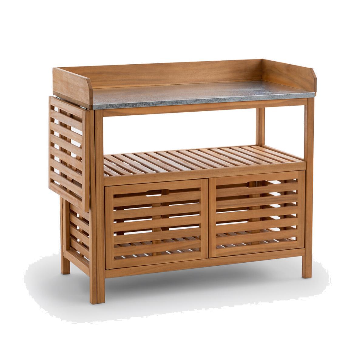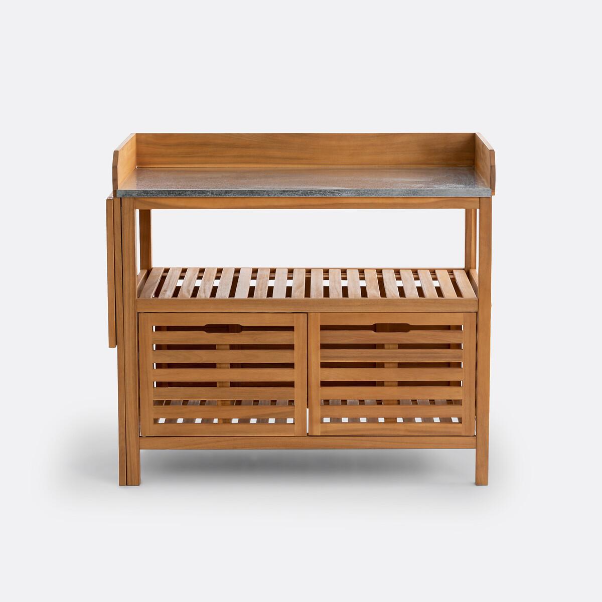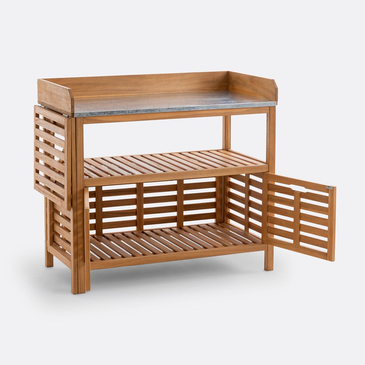 Want to go green?? Discover the perfect gardening table! Practical and well thought out, it will allow you to deposit, repot, prune and take care of your favourite plants.. Its zinc worktop is robust and easy to maintain. Thanks to its numerous storage spaces and its retractable extension, you will be the most organised of gardeners!Product Details • In acacia, stained oiled finish. FSC® certified wood • Zinc top plate • 1 open shelf • 2 doors hide a large storage compartment • 1 extension / folding table. Quality Info • Acacia is a wood that offers good mechanical properties (good resistance to insects and fungi) and is resistant to bad weather (alternation of dry and humid periods). Dimensions • Width without extension: 100cm • Width with extension: 140cm • Height: 90cm • Depth: 50cmDelivery:. Assembly required. Available for home delivery. Note! Please check that all access points are large enough to accommodate your delivery (doors, stairs, lifts). • WOOD FROM SUSTAINABLY MANAGED FORESTS. FSC® certified wood comes from forests that are environmentally, socially and economically well managed. Dimensions and weight of parcel1 parcel • L107 x H21 x D55.5 cm. 25.5kg.