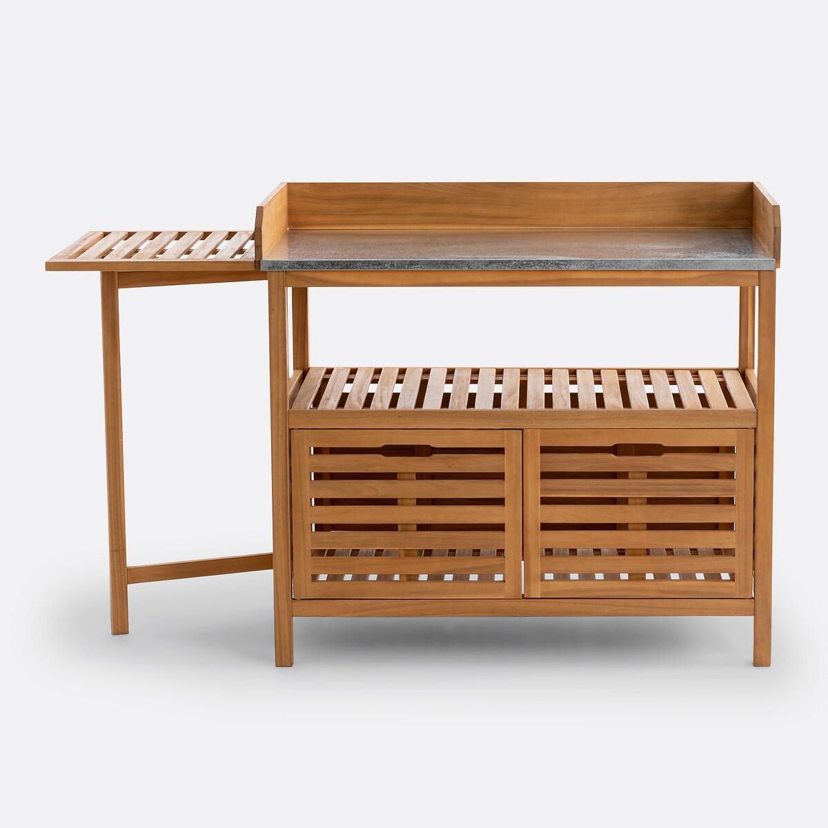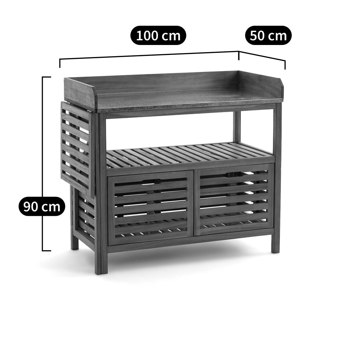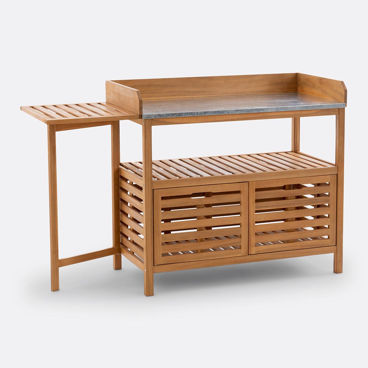Want to go green?? Discover the perfect gardening table! Practical and well thought out, it will allow you to deposit, repot, prune and take care of your favourite plants.. Its zinc worktop is robust and easy to maintain. Thanks to its numerous storage spaces and its retractable extension, you will be the most organised of gardeners!Product Details • In acacia, stained oiled finish. FSC® certified wood • Zinc top plate • 1 open shelf • 2 doors hide a large storage compartment • 1 extension / folding table. Quality Info • Acacia is a wood that offers good mechanical properties (good resistance to insects and fungi) and is resistant to bad weather (alternation of dry and humid periods). Dimensions • Width without extension: 100cm • Width with extension: 140cm • Height: 90cm • Depth: 50cmDelivery:. Assembly required. Available for home delivery. Note! Please check that all access points are large enough to accommodate your delivery (doors, stairs, lifts). • WOOD FROM SUSTAINABLY MANAGED FORESTS. FSC® certified wood comes from forests that are environmentally, socially and economically well managed. Dimensions and weight of parcel1 parcel • L107 x H21 x D55.5 cm. 25.5kg.