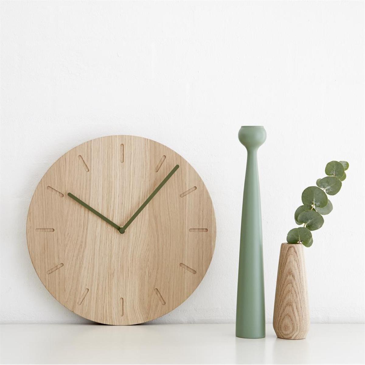 I really like this wall clock - the simple, natural oak finish combined with the green accents makes it a versatile piece. It works especially well in contemporary or Scandinavian-inspired interiors where minimalism and natural materials are key. The understated design means it won't overpower other elements, making it suitable for both living rooms and kitchens. To style it effectively, consider pairing it with neutral tones and wooden furniture for a cohesive look or using it as a subtle pop of colour against a contrasting wall. Practical tip: hang it at eye level in a well-lit spot to keep it functional and stylish.