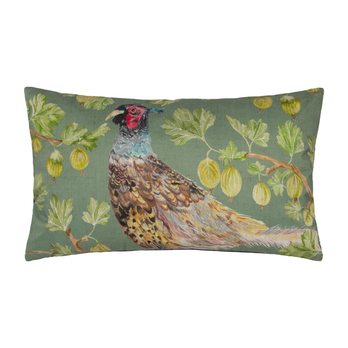 Enjoy this delightful scene from the British countryside of a pheasant poised to peck at the ripe, juicy gooseberries on this beautifully hand-painted watercolour design. The rich, iridescent colours of the male pheasant are made to stand out against the summery, olive green background and are lovingly printed onto UV, water-resistant Polyester fabric. A wonderfully rustic and characterful addition to your outdoor space.