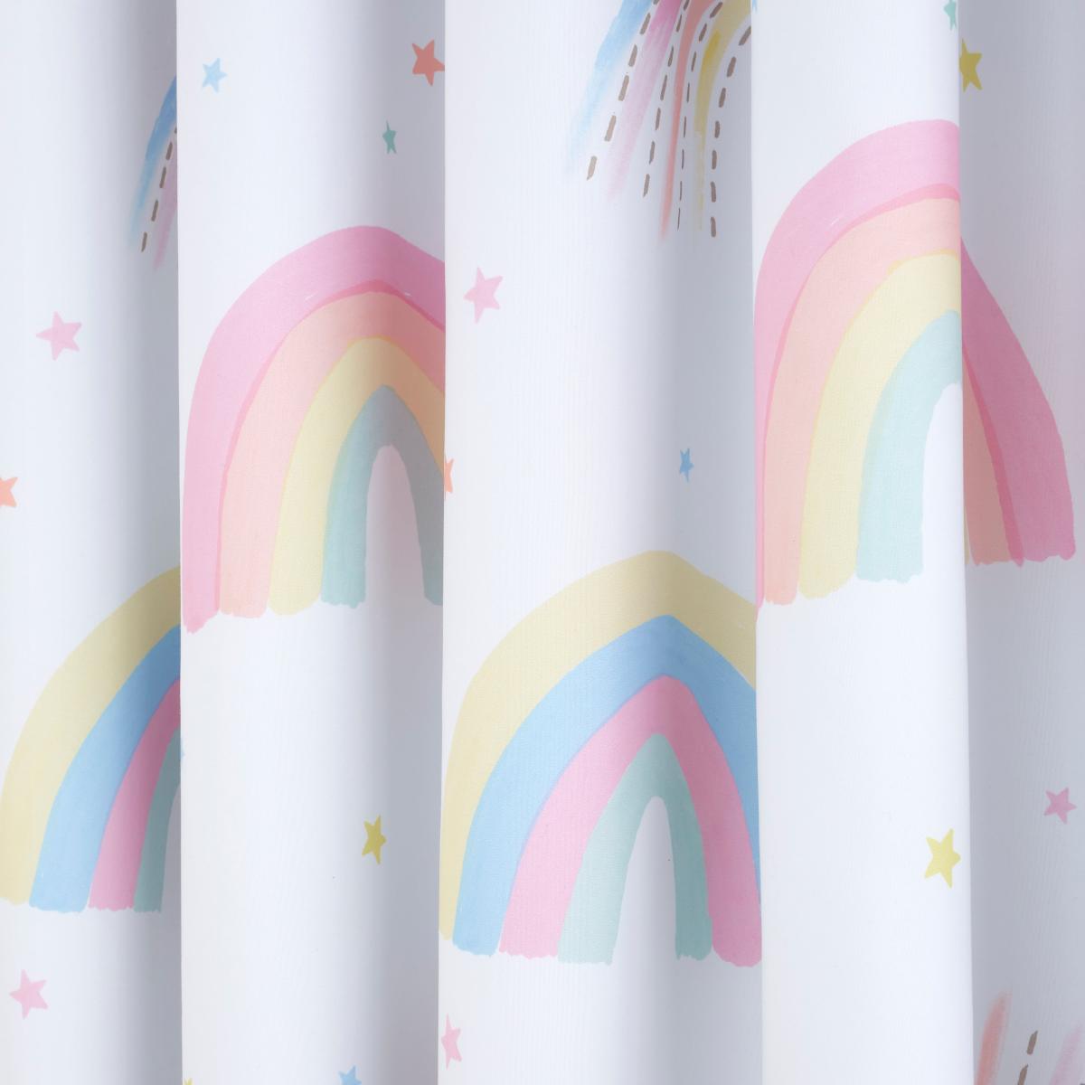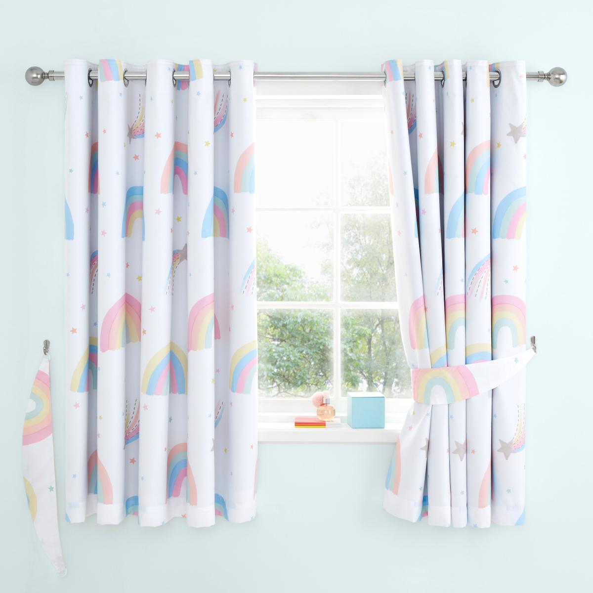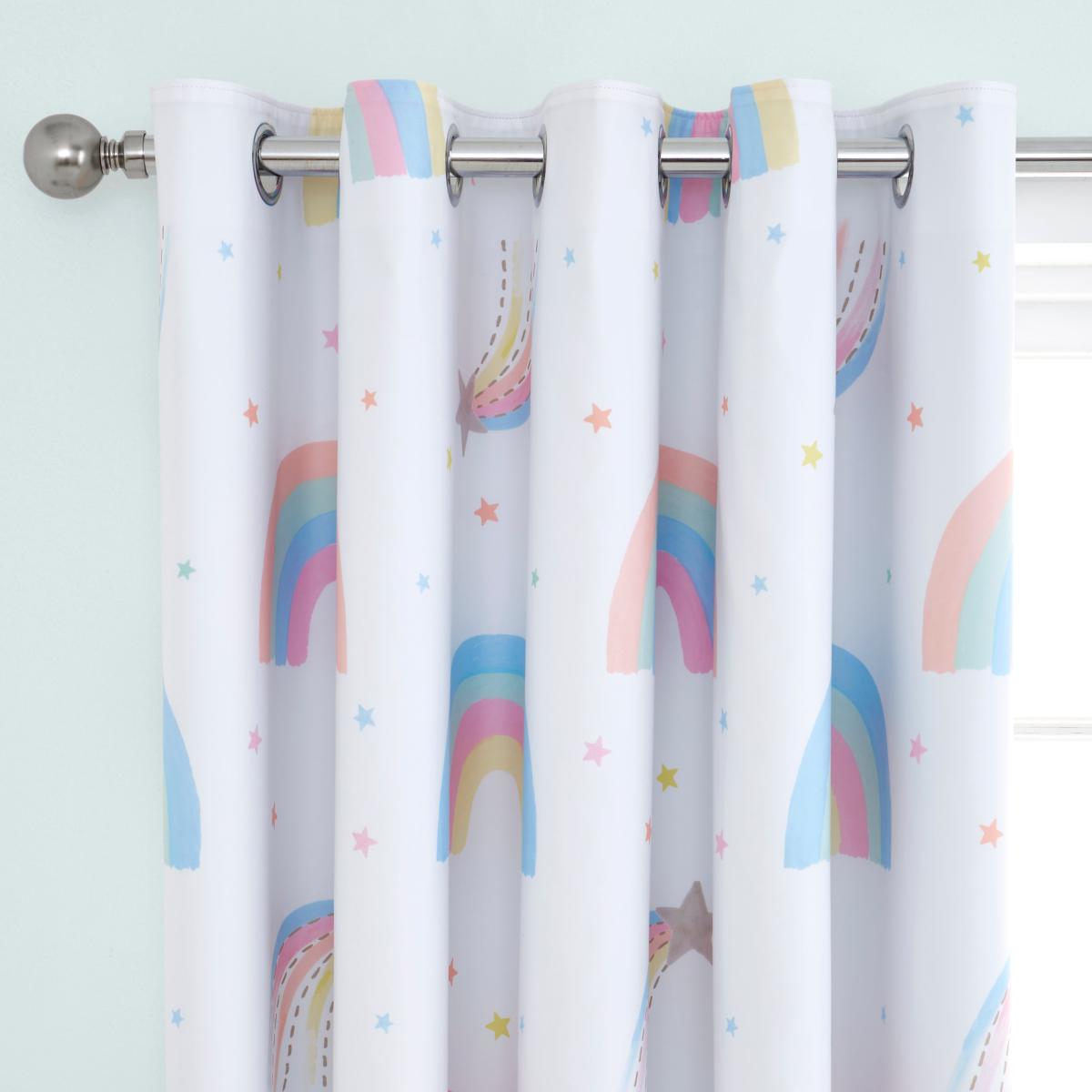* Includes 2 x curtain panels* Eyelet header* Pair of Blackout curtains* Rainbow design* Coordinating bedding available to purchase separately Add a pop of pastel colour to your little ones bedroom with this pair of Watercolour Rainbow eyelet curtains. A fun and colourful way to finish off your little one's bedroom printed with rainbows and shooting stars all over. These curtains feature a blackout lining, reducing unwanted light giving your little one an uninterrupted and dreamy night sleep. Crafted from soft polyester material which can be dry cleaned. Good things come to those who coordinate, so why not pair these curtains with the matching duvet cover and pillowcase set available to purchase separately? This collection is verified by OEKO-TEX and independently tested for harmful substances as well as manufactured using sustainable processes under socially responsible working conditions.
