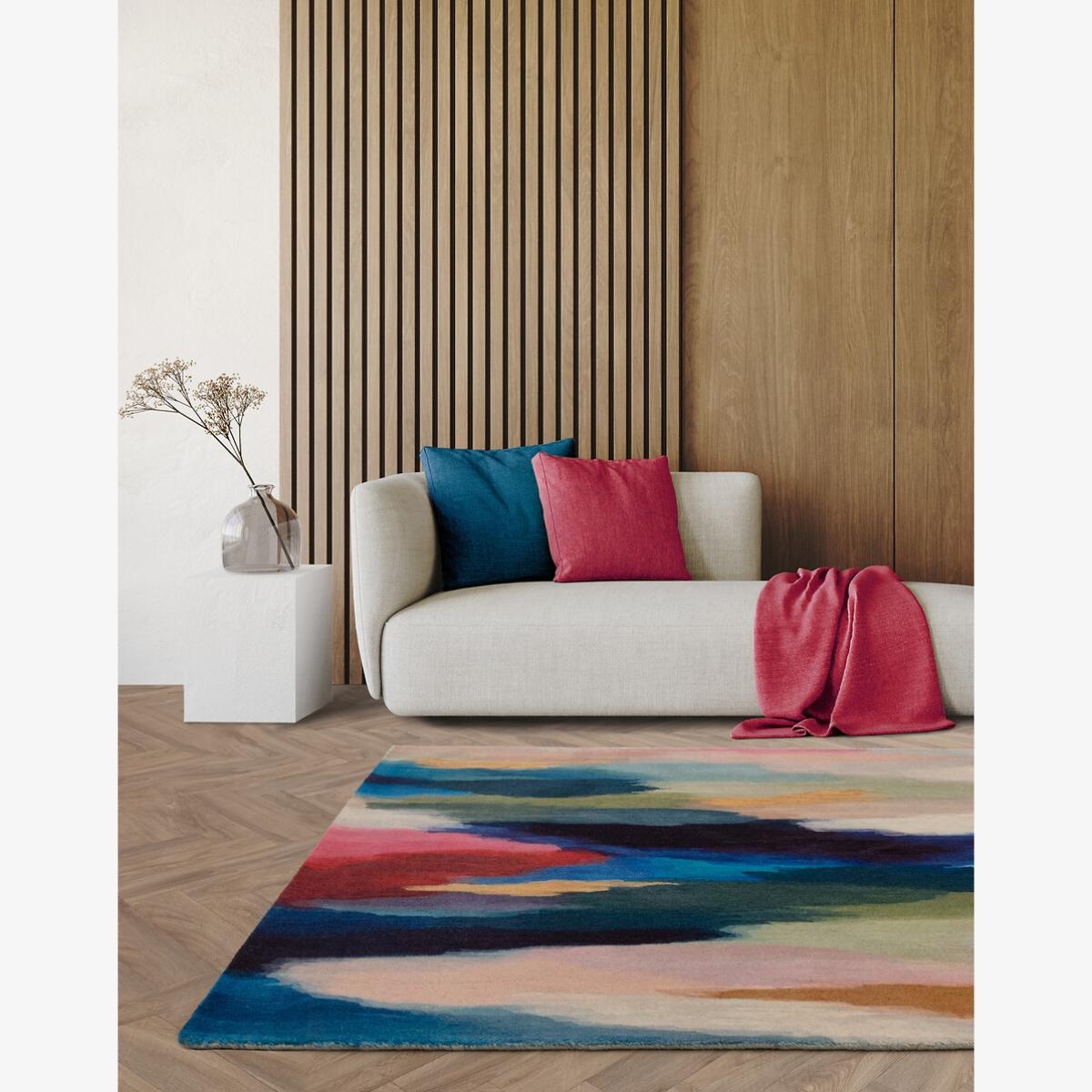 This watercolour-inspired rug is a fantastic addition to contemporary and eclectic interiors, thanks to its vibrant, fluid design and soft wool texture. I love how its colour palette can anchor a neutral room or complement bold, patterned furnishings. It works particularly well in living rooms or bedrooms, adding a splash of colour and texture without overpowering the space. To style it effectively, layer with plain or subtly patterned cushions and throws to keep the look cohesive. Because it's wool, it offers durability and warmth-ideal for high-traffic areas or cosy corners. Just ensure it’s protected from moisture to maintain its vibrancy and longevity.