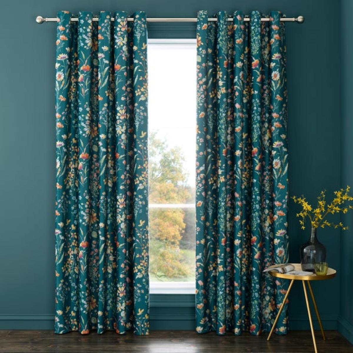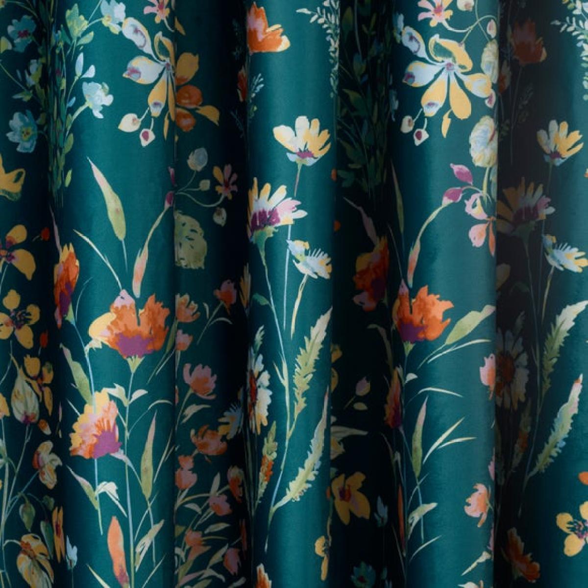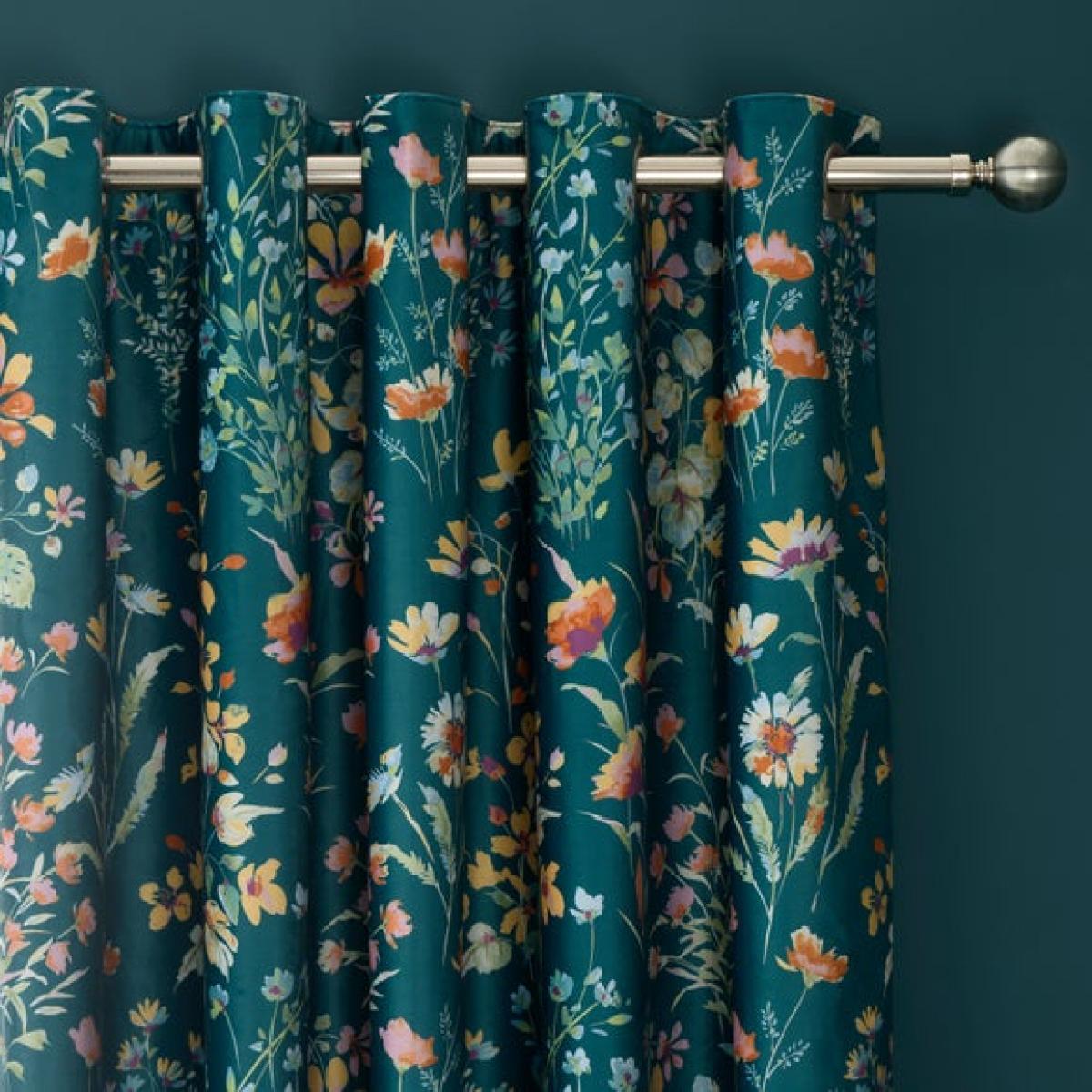 * Luxurious velour finish * Soft touch polyester * Blackout lined * Eyelet header * Minimal iron fabric * Dry clean only * Multiple sizes available Blooming gardens are only steps away with these Watercolour Floral Curtains. Made from beautifully soft polyester velour in a deep peacock shade with a vibrant floral print, these curtains exude luxury whilst being super easy to hang, with their eyelet header. A blackout lining ensures you aren’t disturbed by unwanted light, leading to a peaceful night’s rest. Matching bedding is available for a coordinated, designer-inspired look.