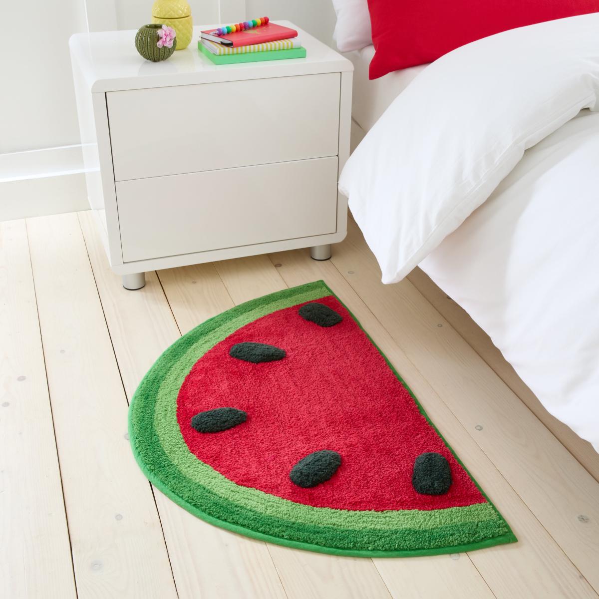 * Watermelon Design * Bold & Vibrant Colour Palette * Includes 3D Elements * Super Soft Feel * Made from 100% Polyester Add a splash of colour to your child's room with the Watermelon Kids Rug. Featuring a bold and vibrant colour palette, this rug boasts a novelty watermelon design; eye-catching 3D elements; and a super soft feel, perfect for underfoot.
