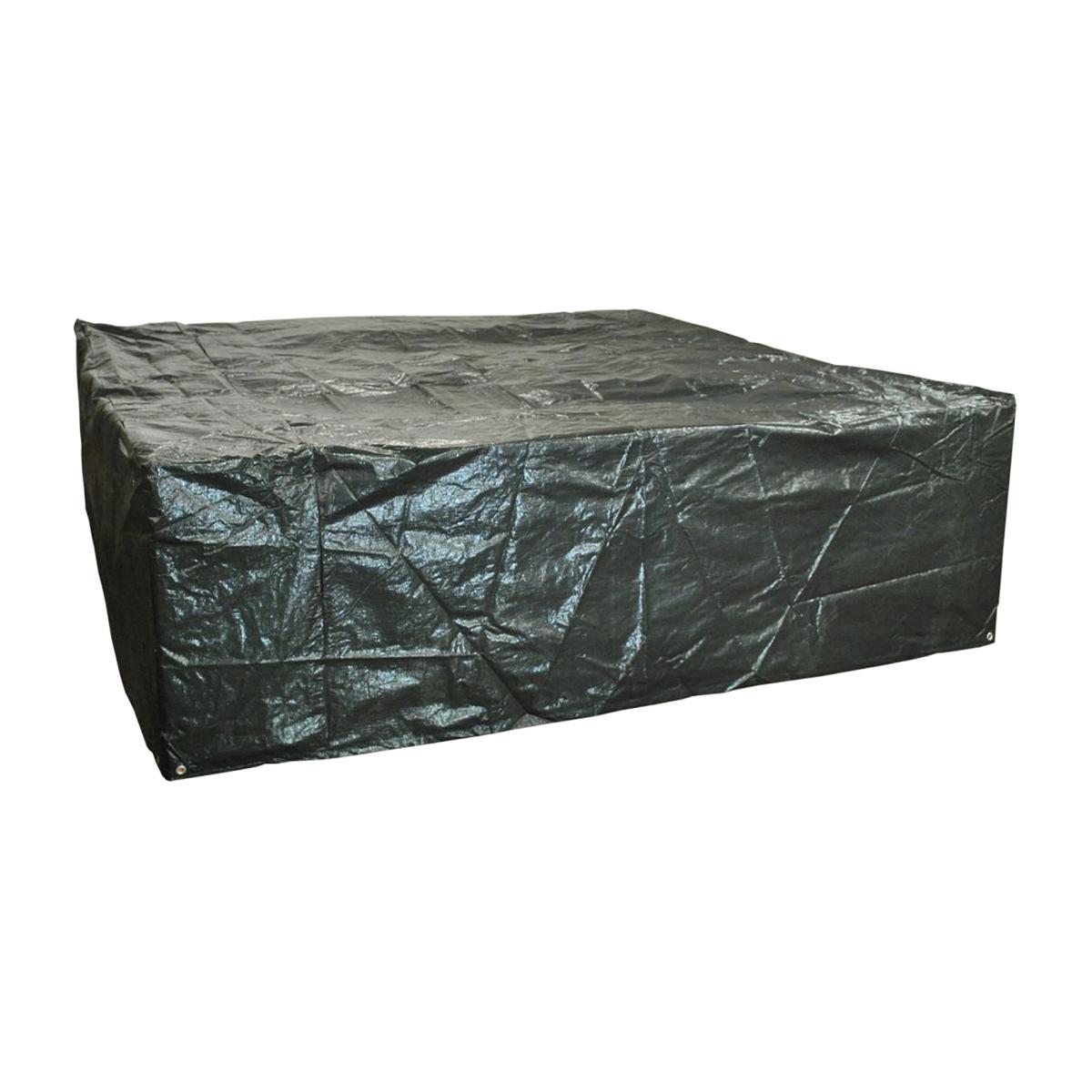 This cube rattan sofa set cover is made from strong, hard-wearing woven polyethene and is double laminated for better protection against weather. Resistant to dust, rain, dew and other debris, it is easily washable and the design of the cover allows you to fold it away compactly for storage. It has sturdy stitched seams which run along the base of the cover while the tear and rip-resistant material provides durability when utilising the cover in harsh weather and conditions. The dimensions for this cover are 255cm by 255cm by and 75cm high, and it has nylon cords to anchor the cover down through metal eyelets at the corners.