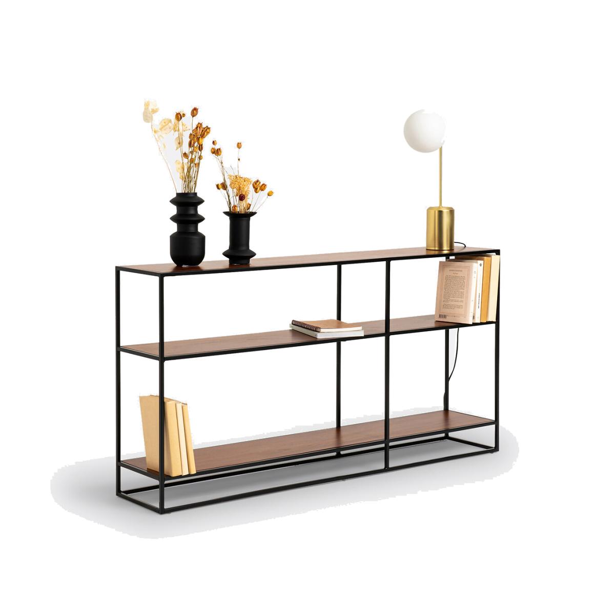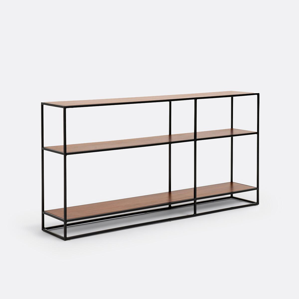 The Watford collection is the latest word in design. A shelving unit that combines dark wood and metal in a contemporary design. Its sleek silhouette will bring character to any interior style. Designed by La Redoute Interiors. Product Details • Matte black lacquered steel frame with an epoxy finish • 3 fixed shelves in walnut veneered MDF, nitrocellulose varnish • Wall fixing points (screws and plugs not supplied) • Protective padsDimensionsDimensions. Total: • Width: 140cm • Height: 70cm • Depth: 25cm. Usable dimensions: • Height between bottom shelf and middle shelf: 35cm • Height between middle shelf and top shelf: 25.5cmDelivery:. Sold pre-assembled. Available for home delivery. Dimensions and weight of parcel • L146 x H31.5 x D77cm • 22kg