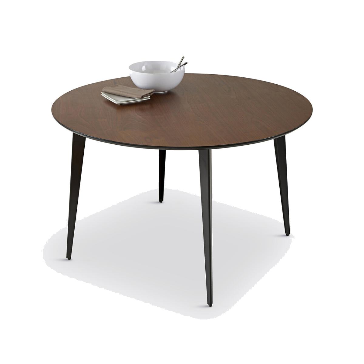 The Watford round dining table with vintage-inspired curves. The characteristic shape straight out of the fifties will bring a vintage touch into the home, that all interior design fans are sure to love!With its strong, original style this retro-contemporary furniture takes a fresh approach to design. Product Details • Bevelled top in walnut-veneer MDF with polyurethane-varnished finish • Base in lacquered black steel with epoxy finish. • Non-slip pads supplied. Dimensions • Diameter: 120cm • Height: 75cmDelivery:. Assembly required. Available for home delivery. Note! Please check that all access points are large enough to accommodate your delivery (doors, stairs, lifts). • WOOD FROM SUSTAINABLY MANAGED FORESTS. FSC® certified wood comes from forests that are environmentally, socially and economically well managed. Dimensions and weight of parcel:2 parcels • 128.5 x 128.5 x 16.5 cm • 83.5 x 42.5 x 14.5 cm • 19.5kg and 8.6kg