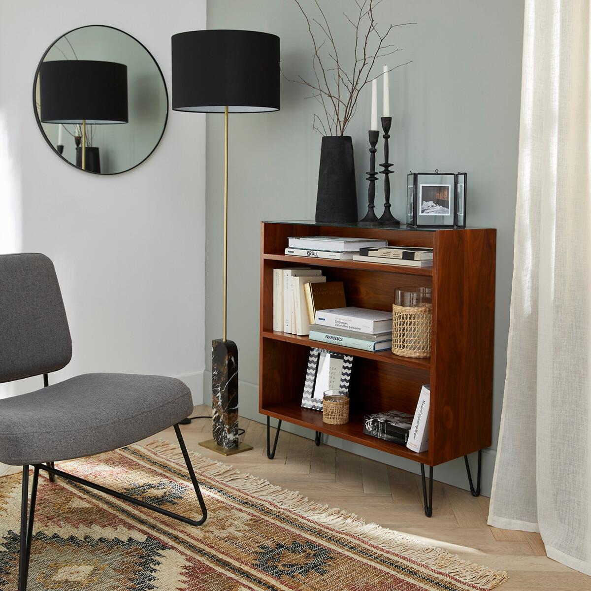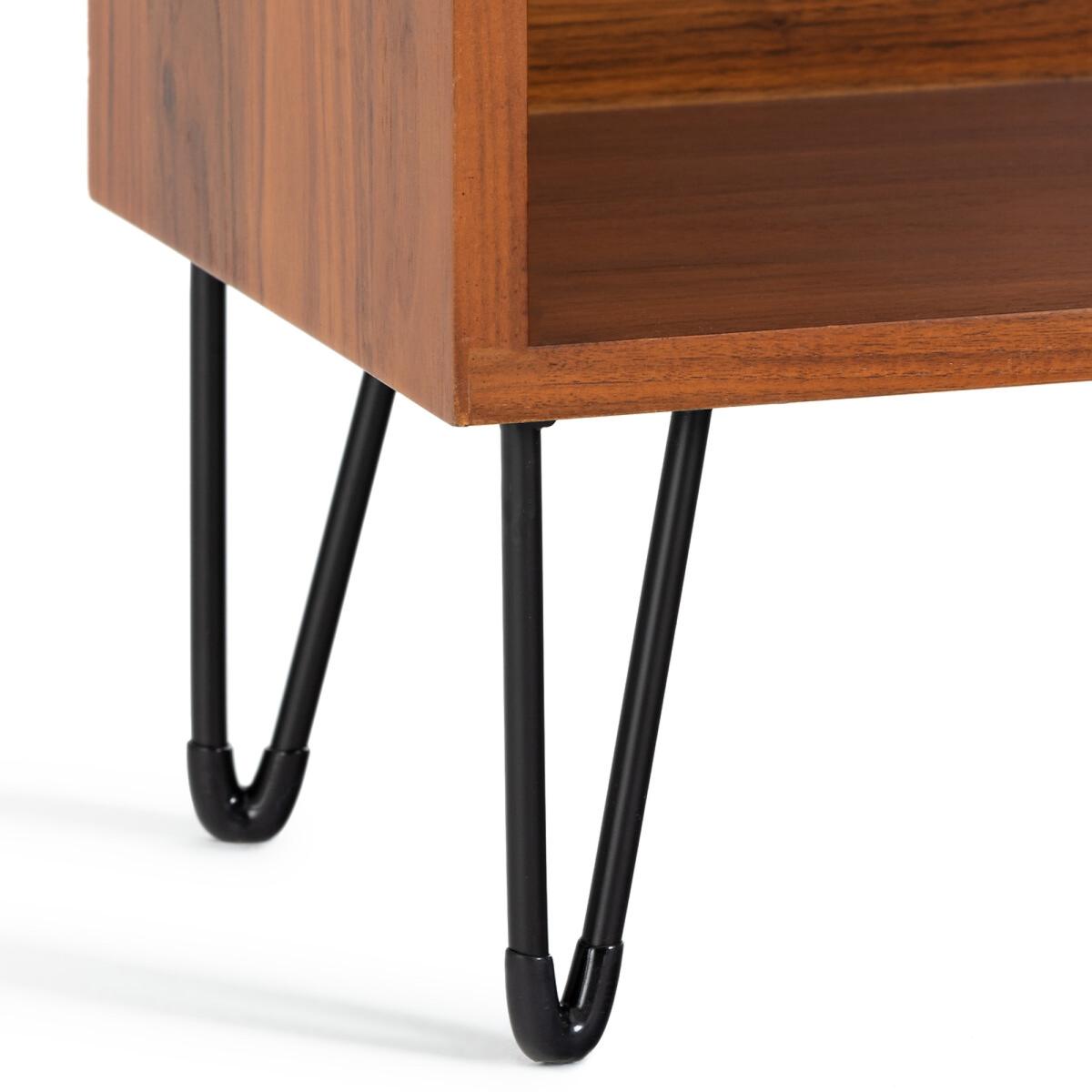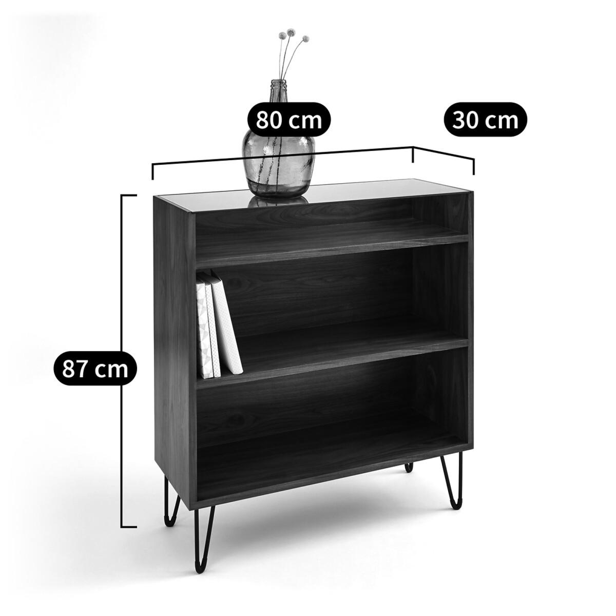 Watford vintage console table with shelving. The vintage look is back and this wood and metal console table with shelving follows the retro trend to perfection. Product Details • 3 compartments (2 large and 1 small) • Slender V-shape metal legs with black epoxy finish and black plastic pads • Legs are self-assembly • Pre-assembled unit in walnut-veneered MDF finished with nitrocellulose varnish • Tempered safety glass top. (8mm thick)Dimensions. Total: • Length: 80cm • Height: 87cm • Depth: 30cm. Usable dimensions: • Large compartment : (2. X) L76 x H26.4 x D28cm • Small compartment: L76 x H11 x D28cmDelivery:. Sold with feet to be attached. It will be delivered to your door. Note! Please check that all access points are large enough to accommodate your delivery (doors, stairs, lifts).Parcel dimensions and weight:1 parcel • L88,5 x H42 x D78,5 cm • 33kg
