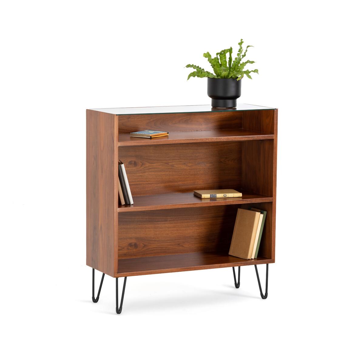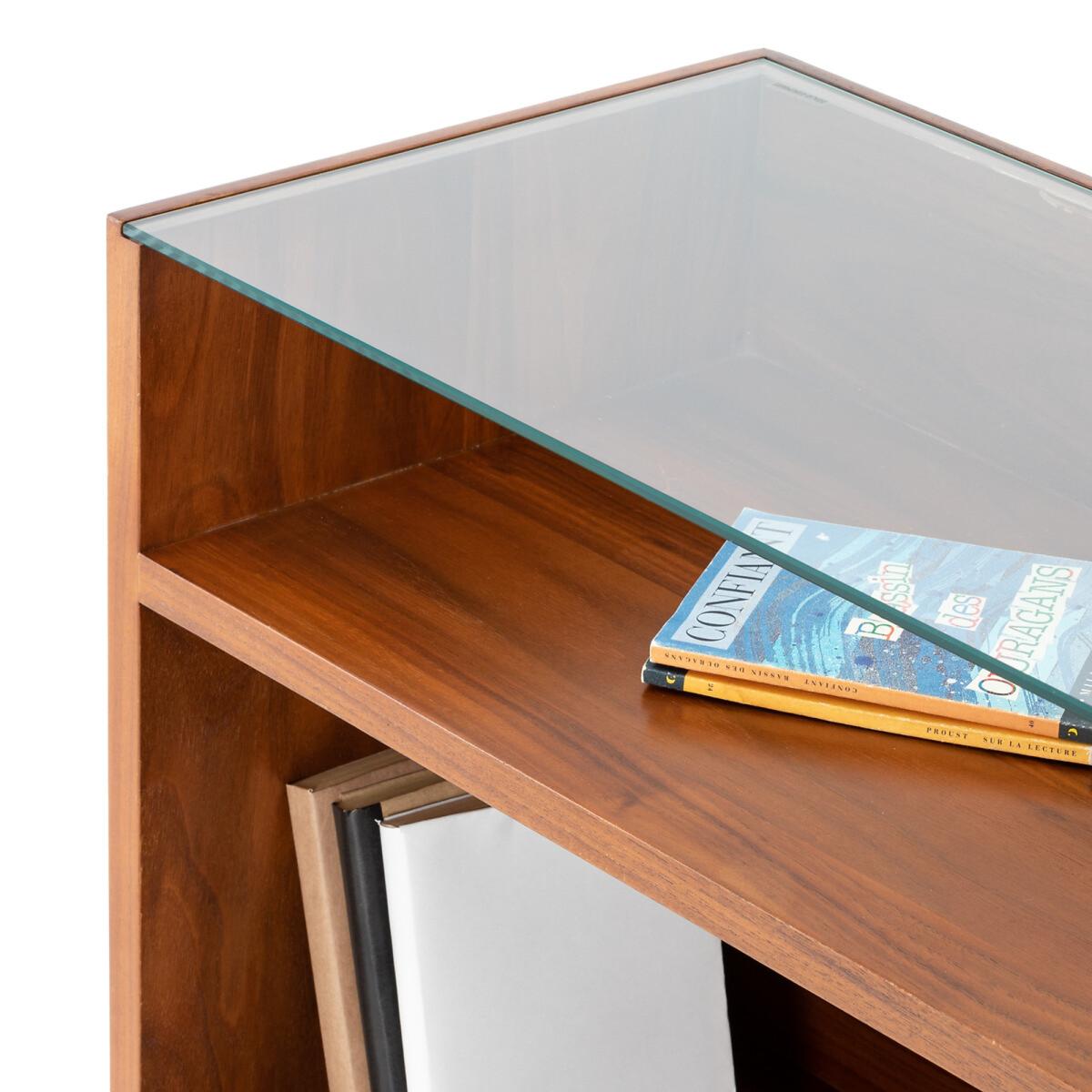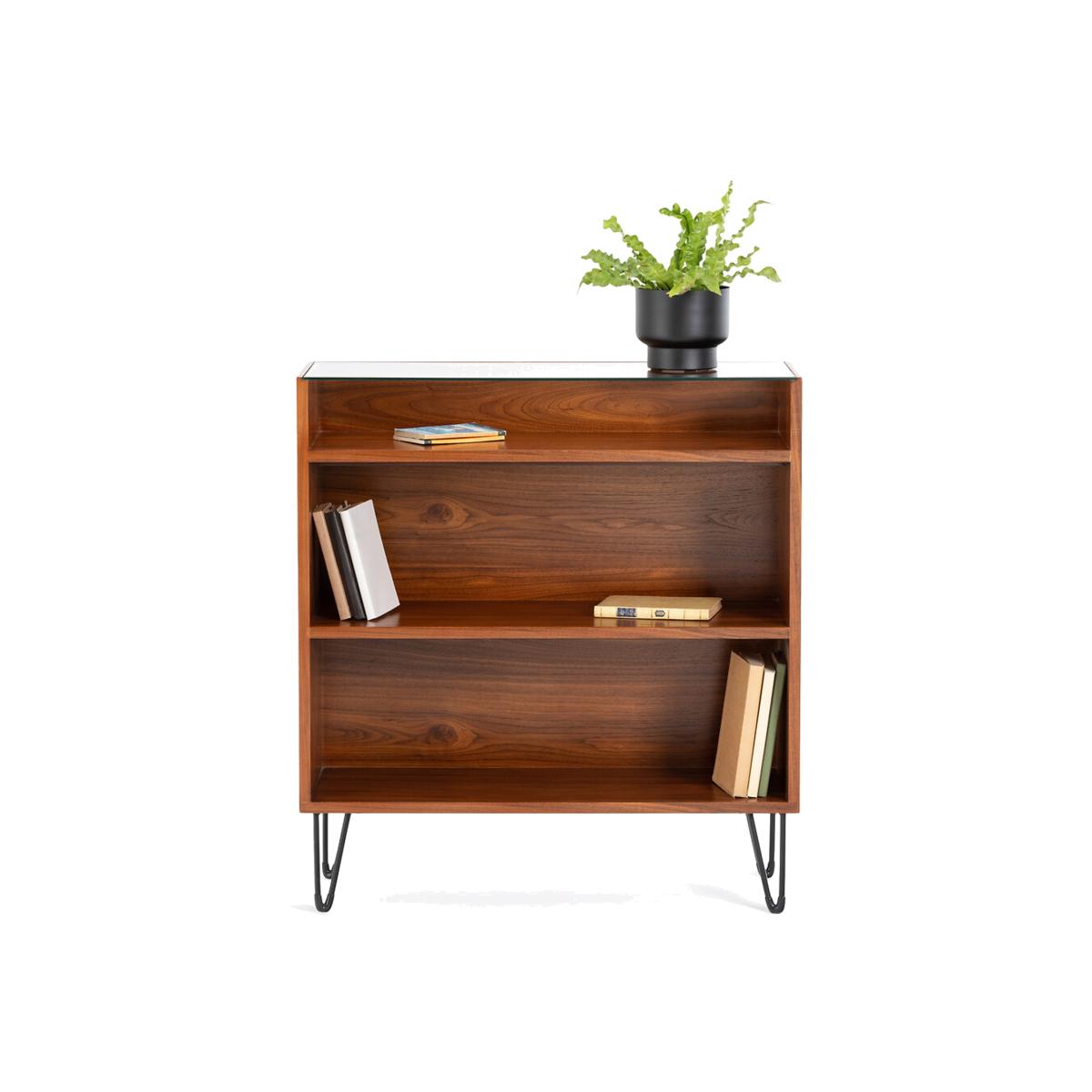 Watford vintage console table with shelving. The vintage look is back and this wood and metal console table with shelving follows the retro trend to perfection. Product Details • 3 compartments (2 large and 1 small) • Slender V-shape metal legs with black epoxy finish and black plastic pads • Legs are self-assembly • Pre-assembled unit in walnut-veneered MDF finished with nitrocellulose varnish • Tempered safety glass top. (8mm thick)Dimensions. Total: • Length: 80cm • Height: 87cm • Depth: 30cm. Usable dimensions: • Large compartment : (2. X) L76 x H26.4 x D28cm • Small compartment: L76 x H11 x D28cmDelivery:. Sold with feet to be attached. It will be delivered to your door. Note! Please check that all access points are large enough to accommodate your delivery (doors, stairs, lifts).Parcel dimensions and weight:1 parcel • L88,5 x H42 x D78,5 cm • 33kg