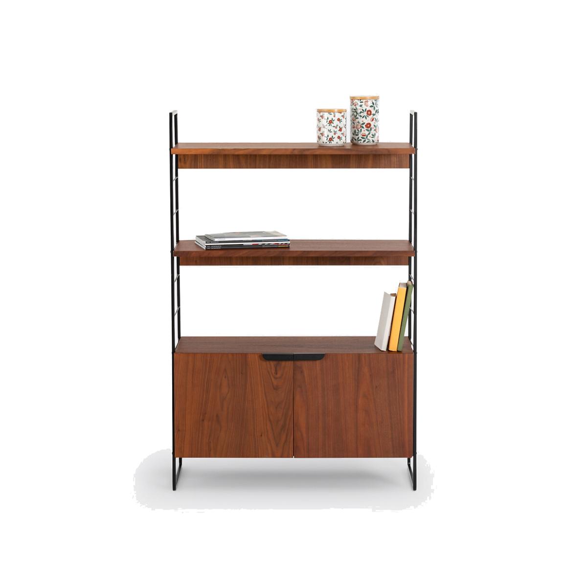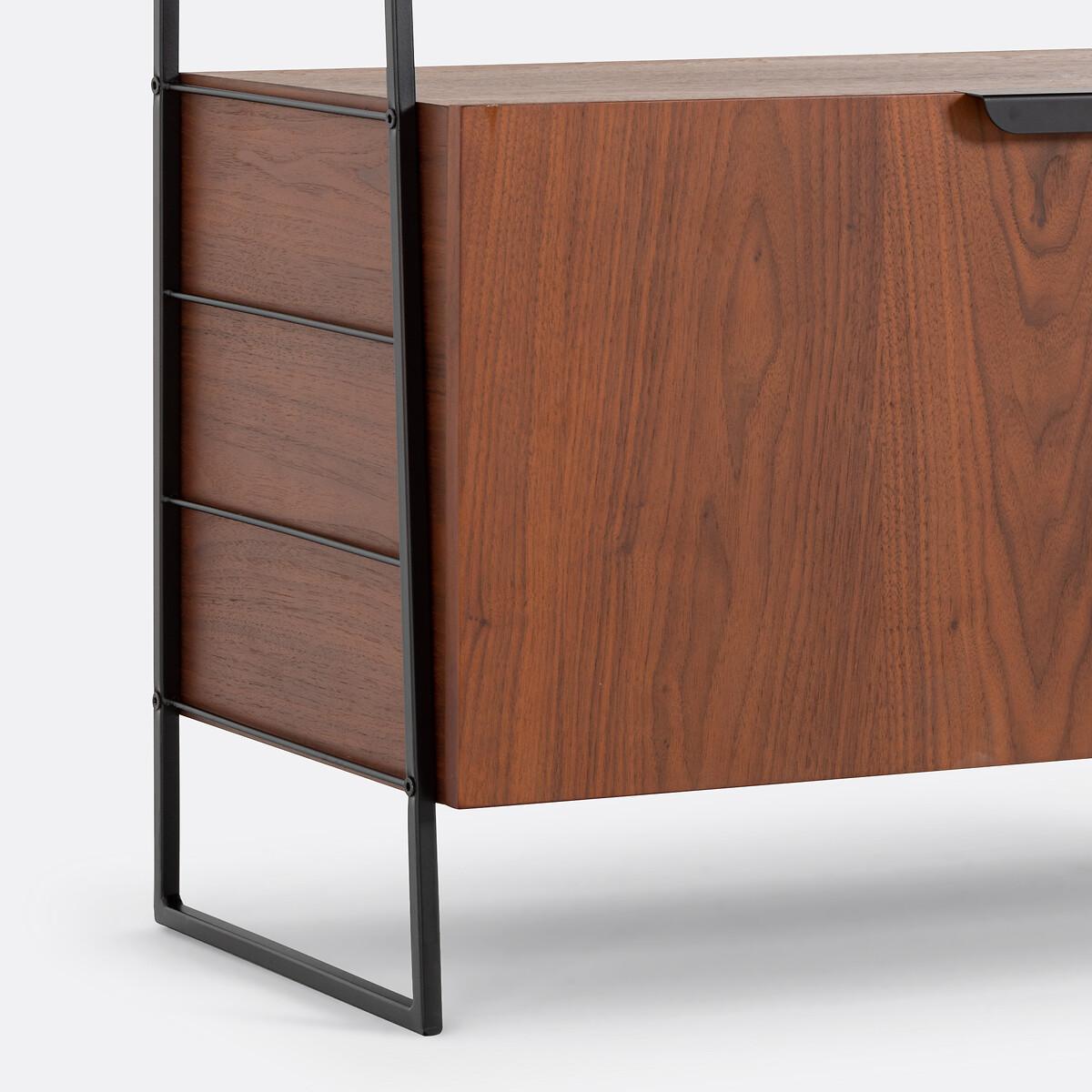 Watford vintage steel and walnut shelving unit. Achieve an elegant and timeless vintage look with this stylish walnut and steel unit. Product Details • 2 shelves • 2-door storage system, 1 large compartment • Side structure in steel with a black epoxy lacquered finish • Storage cabinet in walnut veneered MDF, nitrocellulose varnish finish. Dimensions • Width 80cm • Height 123 cm • Depth 33cm • Weight 27 kgDelivery:. This product is sold for self-assembly. It will be delivered to your door. Note! Please check that all access points are large enough to accommodate your delivery (doors, stairs, lifts).Parcel Dimensions:2 parcels • L127 x H4.5 x D34 cm • L86 x H47.5 x D45 cm