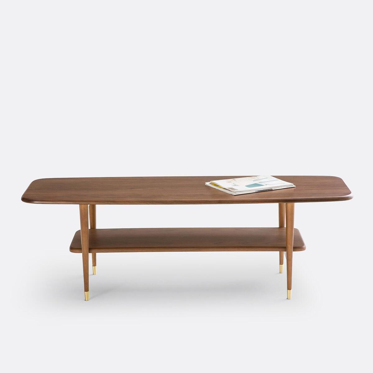 The Watford vintage coffee table. This walnut veneer coffee table has stylish, retro curves for a simple yet elegant finish. Product Details • Compact. • Double chamfered edge top. • Tapered legs. • Walnut veneered MDF tops, varnish finish. • Walnut-stained rubberwood legs, brass tips. Dimensions Total • Length: 130cm • Height: 41cm • Depth: 45cm. Usable dimensions • Height between levels: 20cm. Delivery:This product requires assembly. Available for home delivery. • WOOD FROM SUSTAINABLY MANAGED FORESTS. FSC® certified wood comes from forests that are environmentally, socially and economically well managed. Parcel Dimensions: • 1 parcel. • 143 x 14 x 53cm, 15kg.