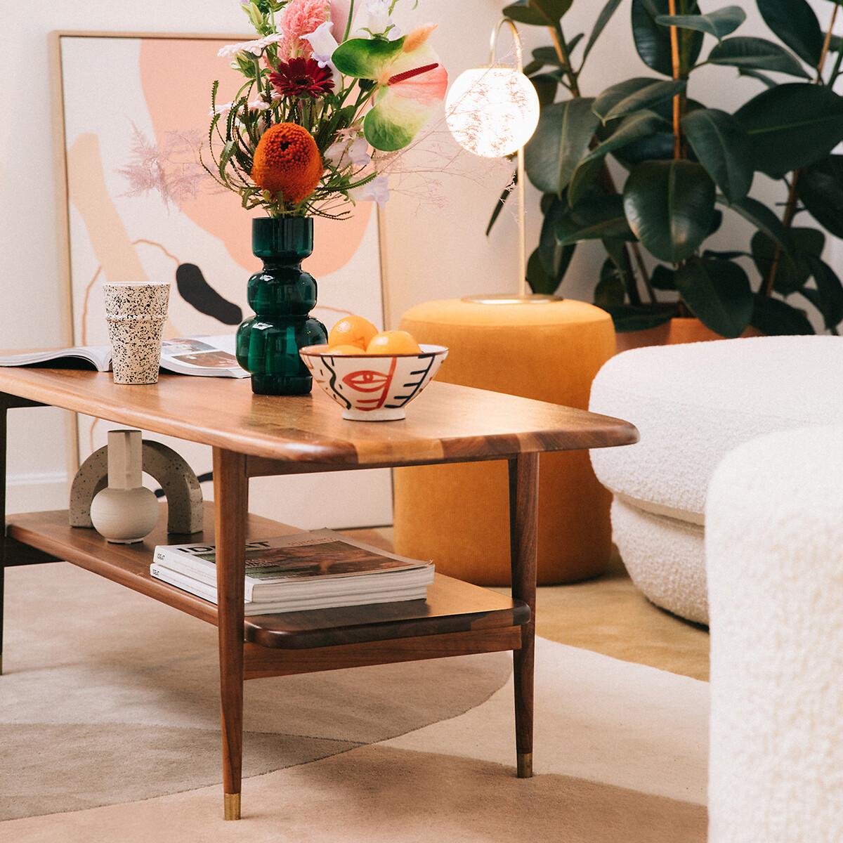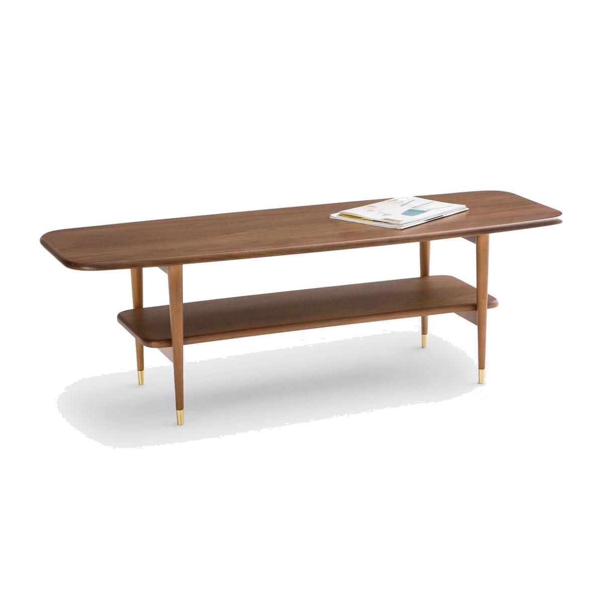 The Watford vintage coffee table. This walnut veneer coffee table has stylish, retro curves for a simple yet elegant finish. Product Details • Compact. • Double chamfered edge top. • Tapered legs. • Walnut veneered MDF tops, varnish finish. • Walnut-stained rubberwood legs, brass tips. Dimensions Total • Length: 130cm • Height: 41cm • Depth: 45cm. Usable dimensions • Height between levels: 20cm. Delivery:This product requires assembly. Available for home delivery. • WOOD FROM SUSTAINABLY MANAGED FORESTS. FSC® certified wood comes from forests that are environmentally, socially and economically well managed. Parcel Dimensions: • 1 parcel. • 143 x 14 x 53cm, 15kg.